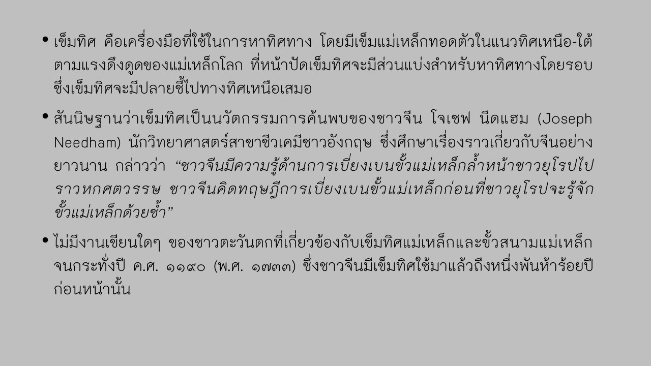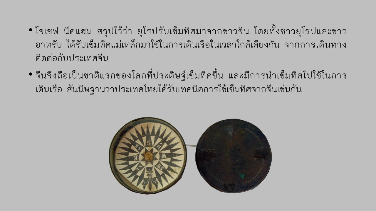 สันนิษฐานกันว่าเข็มทิศเป็นการค้นพบของชาวจีน โดย โจเซฟ นีดแฮม(Joseph Needham) นักวิทยาศาสตร์สาขาชีวเคมี ชาวอังกฤษ ผู้ที่ใช้เวลาค้นคว้าเรื่องราวเกี่ยวกับจีนอย่างยาวนาน กล่าวว่า ชาวจีน “ล้ำหน้าความรู้เกี่ยวกับการเบี่ยงเบนขั้วแม่เหล็กของชาวยุโรปไปราวหกศตวรรษ ชาวจีนคิดทฤษฎีเกี่ยวกับการเบี่ยงเบนขั้วแม่เหล็กก่อนที่ยุโรปจะรู้จักขั้วแม่เหล็กด้วยซ้ำ” ไม่มีการกล่าวถึงเข็มทิศแม่เหล็กและขั้วสนามแม่เหล็กโลกในงานเขียนใดๆ ของตะวันตกจนกระทั่งปี ค.ศ.๑๑๙๐ (พ.ศ.๑๗๓๓) ซึ่งชาวจีนมี เข็มทิศมาแล้วถึงหนึ่งพันห้าร้อยปีก่อนหน้านั้น โจเซฟ นีดแฮม สรุปไว้ว่า ยุโรปได้รับเข็มทิศมาจากชาวจีน และไม่ได้เข้าสู่ยุโรปผ่านทางชาวอาหรับ เป็นไปได้ว่าชาวยุโรปและชาวอาหรับดูเหมือนจะรับเข็มทิศแม่เหล็กมาใช้เดินเรือในช่วงเวลาประมาณเดียวกันจากการเดินทางติดต่อทางเรือกับประเทศจีน ถือได้ว่าจีนเป็นชาติแรกของโลกที่ประดิษฐ์เข็มทิศขึ้น และนำเข็มทิศไปใช้ในการเดินเรือ สันนิษฐานว่าในประเทศไทยน่ามีการได้รับการใช้เข็มทิศจากจีนด้วยเช่นกัน เข็มทิศ แม้เป็นเครื่องมือที่เห็นได้ทั่วไปในปัจจุบันแต่เป็นเครื่องแสดงในเห็นถึงความสามารถของชาวจีนตั้งแต่อดีตที่มีการค้นพบเครื่องมือชิ้นสำคัญให้กับโลกใบนี้ไว้ใช้ประโยชน์ จวบจนปัจจุบัน