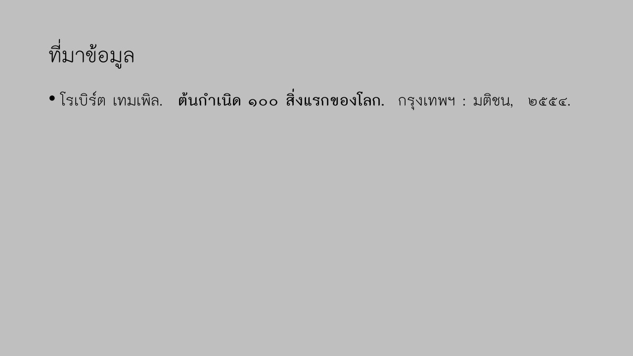 -โรเบิร์ต เทมเพิล. ต้นกำเนิด ๑๐๐ สิ่งแรกของโลก. กรุงเทพฯ : มติชน, ๒๕๕๔.