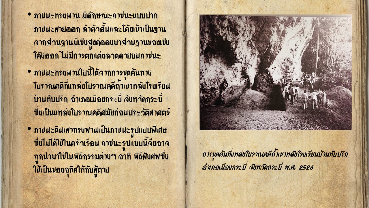 “ภาชนะทรงพาน” ภาชนะทรงพาน ปากภาชนะผายออกลำตัวสั้นและโค้งเข้าเป็นฐาน จากส่วนฐานมีเชิงสูงต่อลงมาส่วนฐานของเชิงโค้งออก ไม่มีการตกแต่งลวดลายบนภาชนะ ภาชนะใบนี้เป็นภาชนะสมัยก่อนประวัติศาสตร์ ภาชนะดินเผาสมัยก่อนประวัติศาสตร์พบหลากหลายรูปทรง เช่น หม้อ ภาชนะทรงปากแตรภาชนะแบบสามขา และภาชนะทรงพาน เป็นต้น ภาชนะดินเผาสมัยก่อนประวัติศาสตร์เป็นภาชนะแบบเนื้อดิน (Earthenware)การผลิตภาชนะดินเผามีขั้นตอนหลักๆ คือ การเตรียมดินและนำดินที่ได้มาผสมเพื่อนำไปขึ้นรูปภาชนะเป็นทรงต่างๆ ซึ่งอาจขึ้นรูปด้วยมือ การตกแต่งผิว เช่น การใช้เชือกทาบ เปลือกหอย และการขูดขีด เป็นต้น จากนั้นจึงตกแต่งบนผิวภาชนะ อาทิ การขัดผิว การทาสี การทาผิวด้วยน้ำดินข้น และการรมควัน เป็นต้น แล้วจึงนำมาตากให้แห้งและเผา ซึ่งการเผาภาชนะในสมัยก่อนประวัติศาสตร์ของภาคใต้คงใช้เตาเผาแบบเปิดซึ่งเป็นการเผากลางแจ้ง ภาชนะทรงพานใบนี้ได้จากการขุดค้นทางโบราณคดีที่เพิงผาถ้ำหลังโรงเรียน บ้านทับปริกอำเภอเมืองจังหวัดกระบี่ ซึ่งเป็นแหล่งโบราณคดีสมัยก่อนประวัติศาสตร์ ภาชนะดินเผาทรงพานเป็นภาชนะรูปแบบพิเศษซึ่งไม่ได้ใช้ในครัวเรื่อง ภาชนะรูปแบบนี้จึงอาจถูกนำมาใช้ในพิธีกรรมต่างๆ อาทิ พิธีฝังศพซึ่งใช้เป็นของอุทิศให้กับผู้ตาย ภาชนะทรงพานจึงถือเป็นหลักฐานที่แสดงให้เห็นถึงความสามารถของการผลิตภาชนะดินเผาของคนสมัยก่อนประวัติศาสตร์และเป็นหลักฐานที่เกี่ยวข้องกับพิธีกรรมในอดีตอีกด้วย