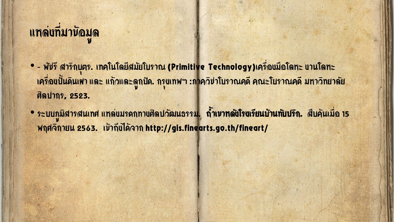 - พัชรี สาริกบุตร. เทคโนโลยีสมัยโบราณ (Primitive Technology)เครื่องมือโลหะ งานโลหะ เครื่องปั้นดินเผา และ แก้วและลูกปัด. กรุงเทพฯ : ภาควิชาโบราณคดี คณะโบราณคดี มหาวิทยาลัยศิลปากร, ๒๕๒๓.