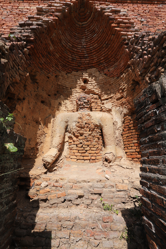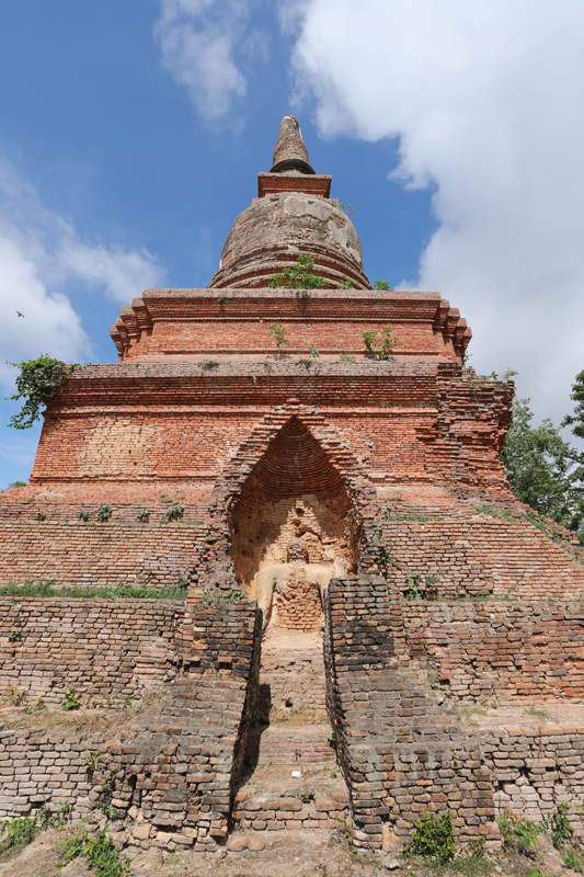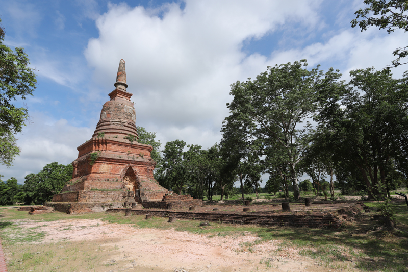 ๑. เจดีย์ประธานทรงระฆังขนาดใหญ่ ก่อด้วยอิฐ ตั้งอยู่บนฐานสูงเป็นรูปสี่เหลี่ยม ขนาดกว้างด้านละ ๑๗ เมตร ที่ฐานด้านตะวันออกและตะวันตก ทำเป็นซุ้มจระนำประดิษฐานพระพุทธรูปประทับนั่ง โดยเฉพาะซุ้มด้านทิศตะวันออกปรากฏร่องรอยการก่อเป็นซุ้มโค้งสูงขึ้นไปคล้ายกรวยแหลม