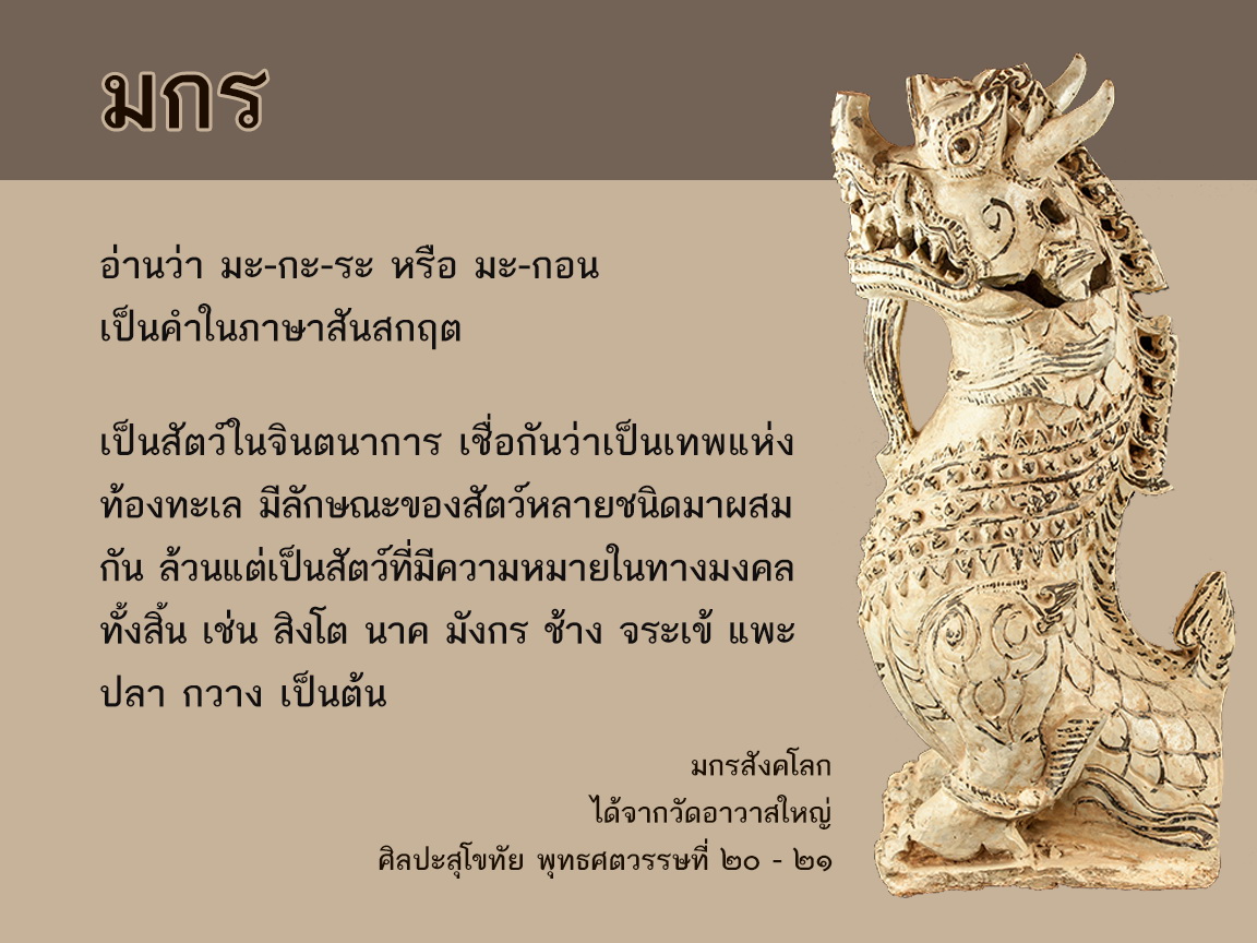 มกรถือเป็นสัตว์ในจินตนาการ เชื่อกันว่าเป็นเทพแห่งท้องทะเล มีลักษณะของสัตว์หลายชนิดมาผสมกัน ทั้งระหว่างสัตว์บกและสัตว์น้ำ อาทิ มีส่วนปากคล้ายจระเข้ มีงวงเหมือนกับช้าง มีลำตัวและหางเหมือนปลา และมีลักษณะของสัตว์อื่น ๆ เพิ่มเติมหลายชนิดมากยิ่งขึ้นตามจินตนาการของช่าง เช่น สิงโต แพะ กวาง นาค มังกร เป็นต้น ซึ่งล้วนแต่เป็นสัตว์ที่มีความหมายในทางมงคลทั้งสิ้น