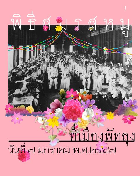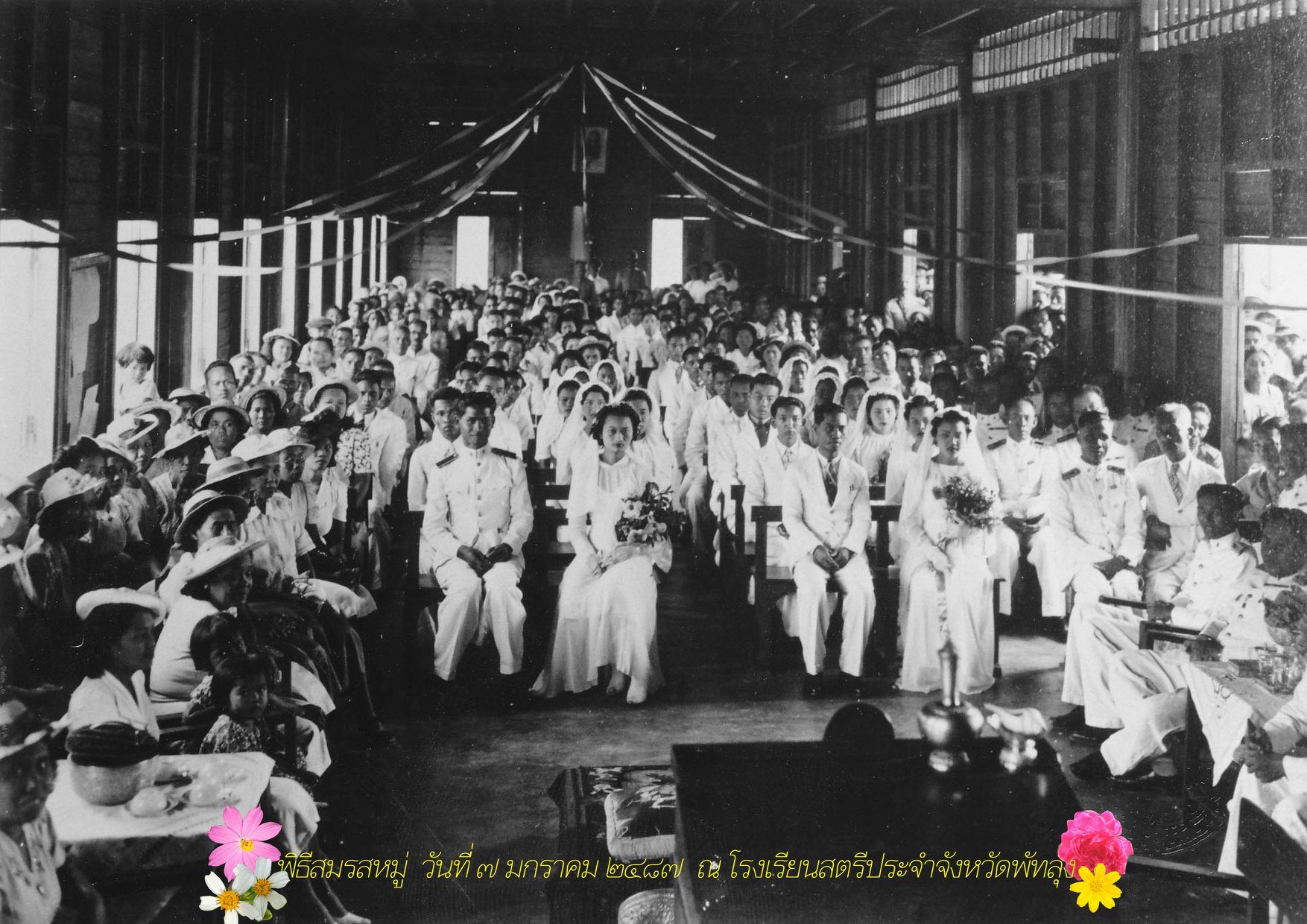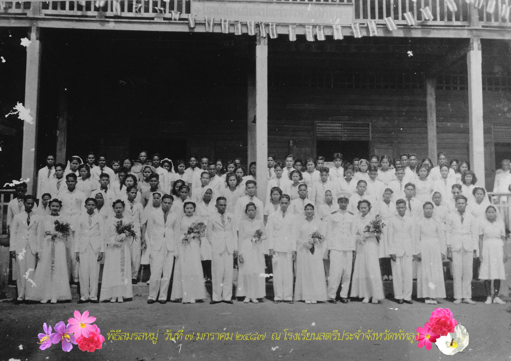 ในหอจดหมายเหตุแห่งชาติ มีภาพถ่ายเก่าชุดหนึ่งระบุว่า “จ.พัทลุง พิธีสมรสหมู่ ๗ ม.ค.๘๗ โรงเรียนสตรีประจำจังหวัดพัทลุง”