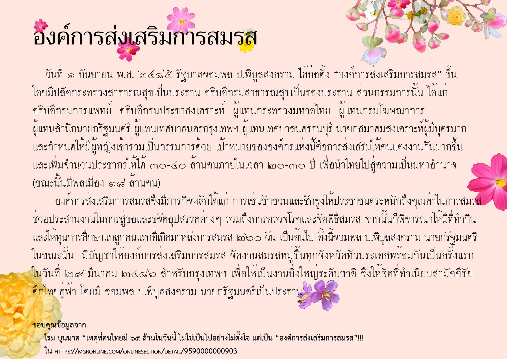 วันที่ ๑ กันยายน พ.ศ. ๒๔๘๕ รัฐบาลจอมพล ป.พิบูลสงคราม ได้ก่อตั้ง “องค์การส่งเสริมการสมรส” ขึ้นโดยมีปลัดกระทรวงสาธารณสุขเป็นประธาน อธิบดีกรมสาธารณสุขเป็นรองประธาน ส่วนกรรมการนั้นได้แก่อธิบดีกรมการแพทย์ อธิบดีกรมประชาสงเคราะห์ ผู้แทนกระทรวงมหาดไทย ผู้แทนกรมโฆษณาการ ผู้แทนสำนักนายกรัฐมนตรี ผู้แทนเทศบาลนครกรุงเทพฯ ผู้แทนเทศบาลนครธนบุรี นายกสมาคมสงเคราะห์ผู้มีบุตรมาก และกำหนดให้มีผู้หญิงเข้าร่วมเป็นกรรมการด้วย เป้าหมายขององค์กรแห่งนี้คือการส่งเสริมให้คนแต่งงานกันมากขึ้น และเพิ่มจำนวนประชากรให้ได้ ๓๐-๔๐ ล้านคนภายในเวลา ๒๐-๓๐ ปี เพื่อนำไทยไปสู่ความเป็นมหาอำนาจ (ขณะนั้นมีพลเมือง ๑๘ ล้านคน)