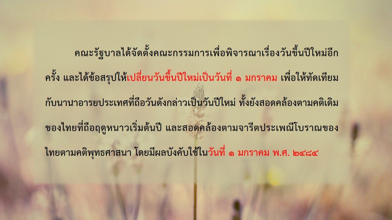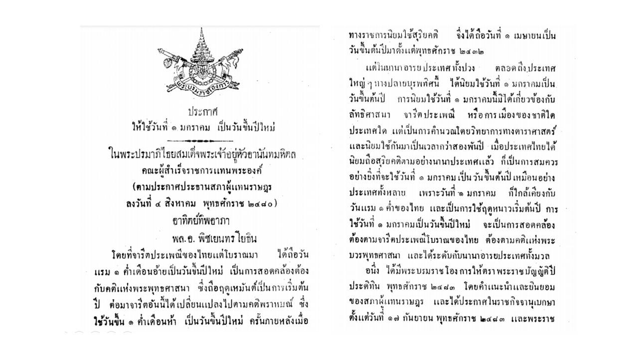 องค์ความรู้ เรื่อง "การเปลี่ยนวันขึ้นปีใหม่เป็นวันที่ ๑ มกราคม" เรียบเรียงข้อมูลโดย นายชัยสิทธิ์ ปะนันวงค์ นักอักษรศาสตร์ปฏิบัติการ กลุ่มประวัติศาสตร์ สำนักวรรณกรรมและประวัติศาสตร์