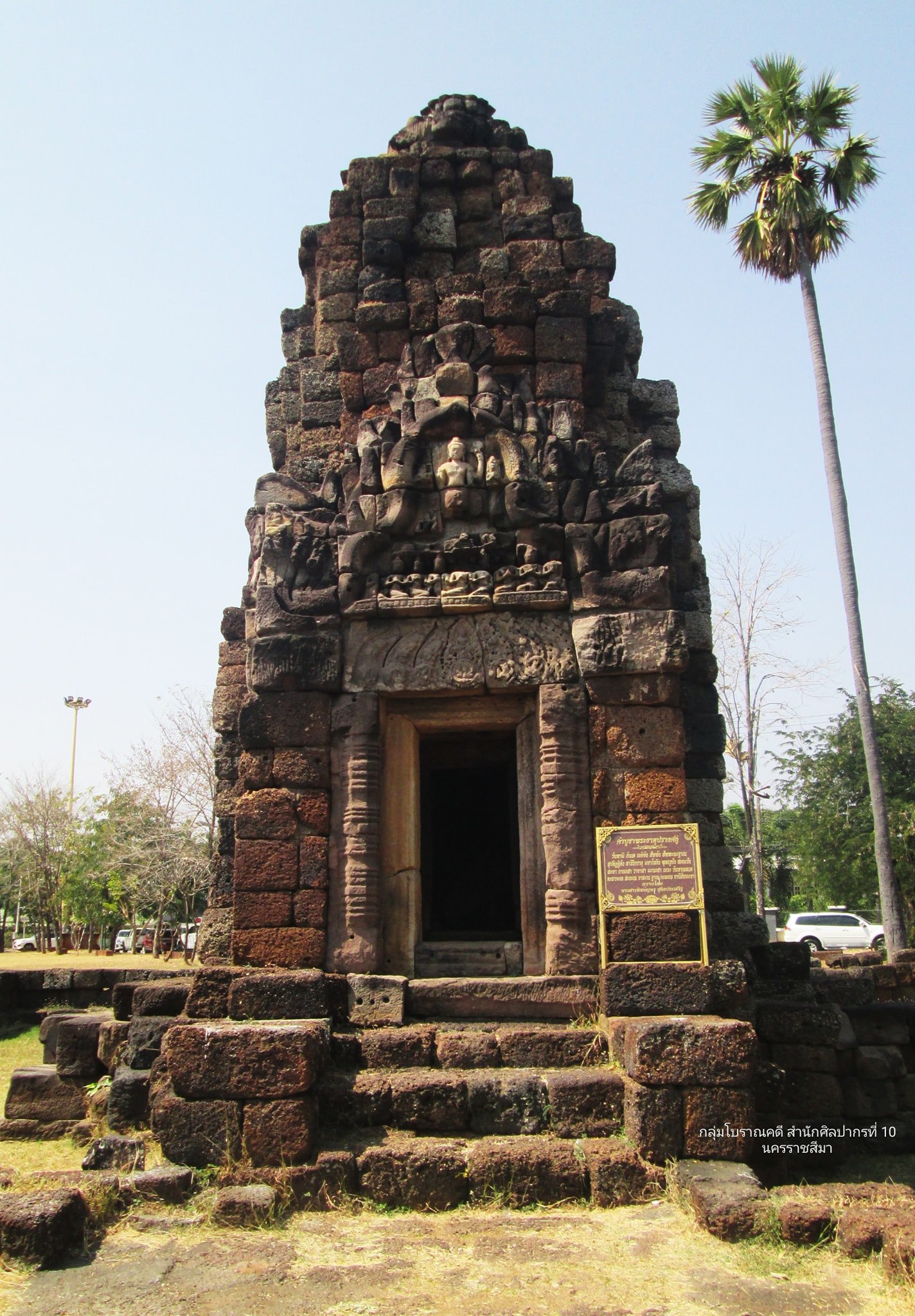 #หน้าบันเหนือทับหลังปราสาทประธานประตูด้านตะวันออก ประกอบด้วยหินทรายที่วางเรียงเป็นส่วนหน้าบัน สลักภาพพระโพธิสัตว์อวโลกิเตศวร 4 กร ประทับยืน มีสาวก 9 องค์ (คน) นั่งพนมมืออยู่ด้านล่าง