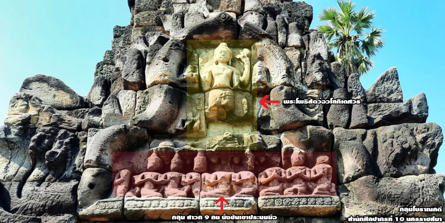 หน้าบัน #สลักภาพพระโพธิสัตว์อวโลกิเตศวร 4 กร ประทับยืน สภาพชำรุดแตกหัก คงเหลือสภาพไม่ครบส่วน ท่อนล่างส่วนเท้าและขาขาดหายไป พระหัตถ์ซึ่งสภาพสมบูรณ์นั้นจะมี 4 กร พระหัตถ์ขวาบนถือลูกประคำ พระหัตถ์ขวาล่างถือดอกบัว พระหัตถ์ซ้ายบนถือคัมภีร์ และพระหัตถ์ซ้ายล่างถือ ก้อนดิน (แท่งทรงกระบอก) ปัจจุบันคงเหลือเฉพาะพระหัตถ์ซ้ายบน ด้านขวาและด้านซ้ายของพระโพธิสัตว์ คงเหลือภาพของบุคคลยืนอยู่ด้านละ 1 องค์ (คน) ไม่ชัดเจนว่าเป็นบุคคล พระโพธิสัตว์หรือเทพองค์ใด ด้านล่างของภาพ ใต้แท่นฐานที่พระโพธิสัตว์ประทับยืน มีภาพบุคคลในท่านั่งพนมมือเรียงกัน 9 คน ที่กึ่งกลางภาพเป็นบุคคลนั่งในท่าขัดสมาธิ หันลำตัวตรงออกทางด้านหน้า ส่วนเศียรชำรุดขาดหายไป ด้านวามือและด้านซ้ายมือ มีบุคคลนั่งด้านละ 4 คน ในลักษณะหันเข่าด้านข้างเข้าสู่ด้านใน แต่ส่วนลำตัวและเศียรหันตรงออกด้านหน้า ในภาพรวมน่าจะหมายถึงเหล่าสาวกหรือผู้ที่ให้การนับถือพระโพธิสัตว์อวโลกิเตศวร นั่งถวายการเคารพ