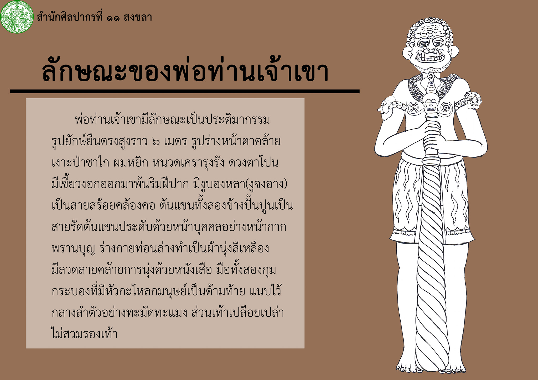 พ่อท่านเจ้าเขามีลักษณะเป็นประติมากรรมรูปยักษ์ยืนตรงสูงราว ๖ เมตร รูปร่างหน้าตาคล้ายเงาะป่าซาไก ผมหยิก หนวดเครารุงรัง ดวงตาโปน มีเขี้ยวงอกออกมาพ้นริมฝีปาก มีงูบองหลา(งูจงอาง) เป็นสายสร้อยคล้องคอ ต้นแขทั้งสองข้างปั้นปูนเป็นสายรัดต้นแขนประดับด้วยหน้าบุคคลอย่างหน้ากากพรานบุญ ร่างกายท่อนล่างทำเป็นผ้านุ่งเหลืองมีลวดลายคล้ายการนุ่งด้วยหนังเสือ มือทั้งสองกุมกระบองที่มีหัวกะโหลกมนุษย์เป็นด้ามท้าย แนบไว้กลางลำตัวอย่างทะมัดทะแมง ส่วนเท้าเปลือยเปล่าไม่สวมรองเท้า