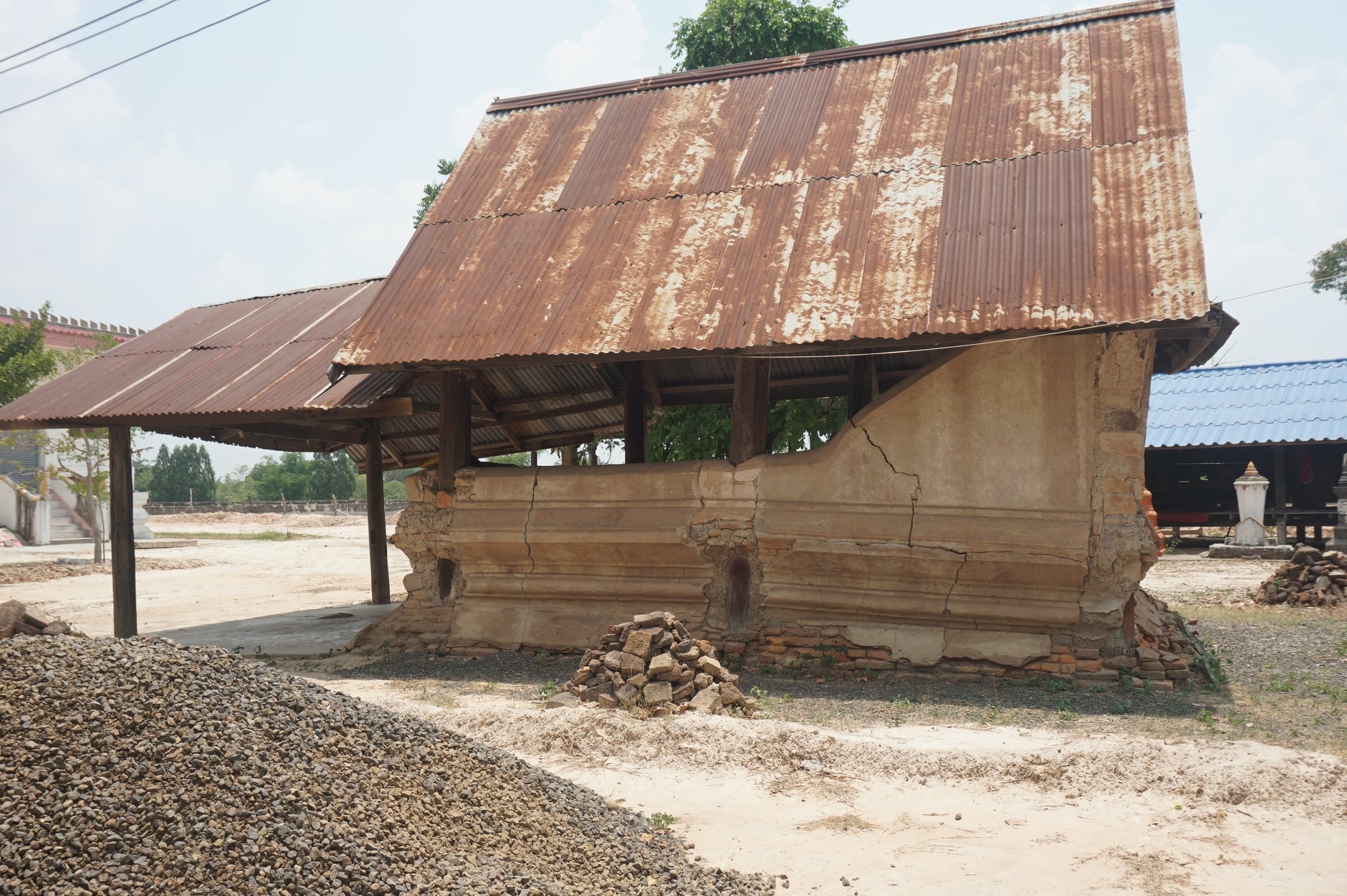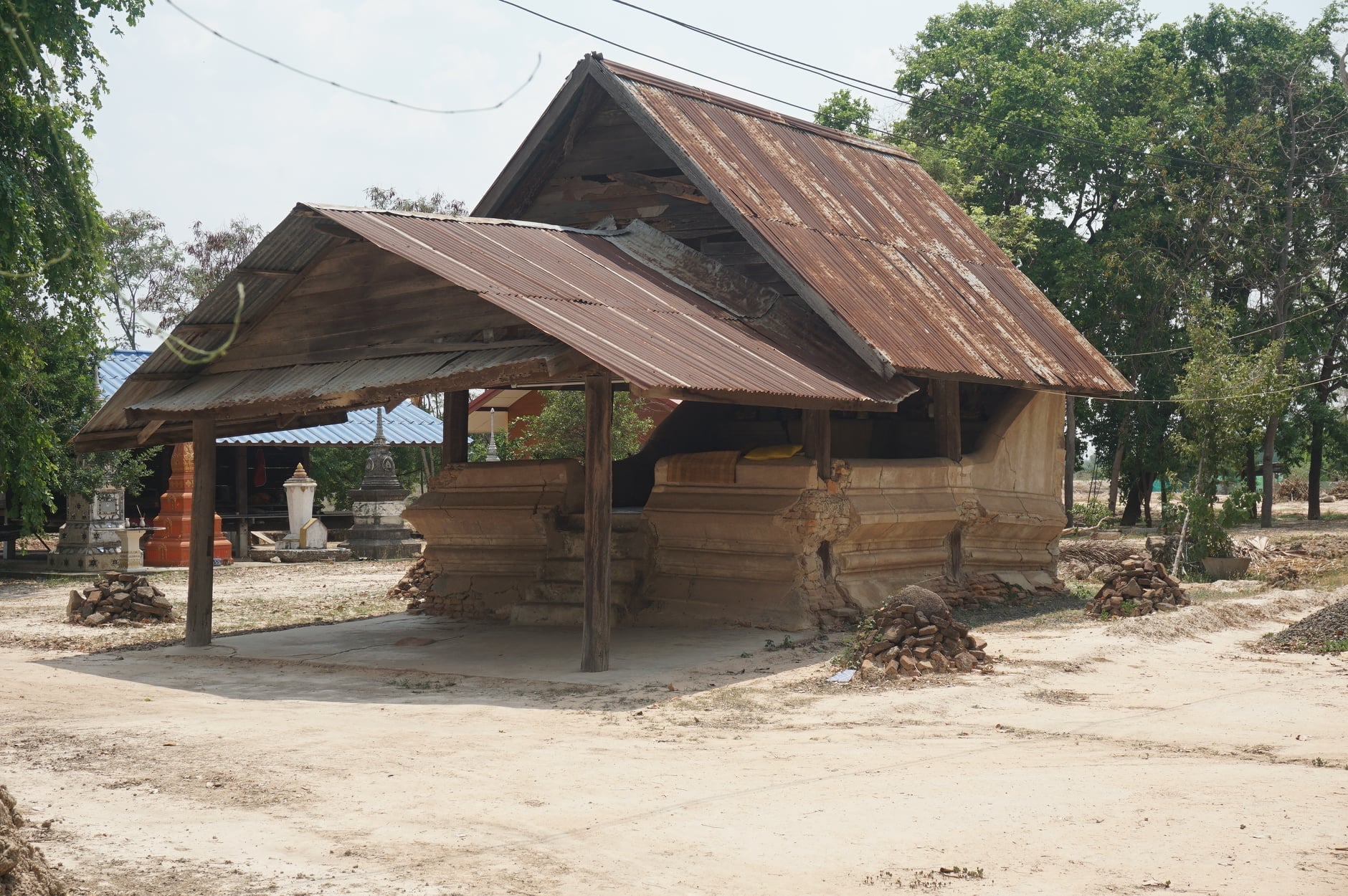 พื้นที่ดินโดยรอบสิมได้รับการถมปรับขึ้นมาอีกประมาณ ๐.๕๐ เมตร จากระดับพื้นดินเดิม จนฐานเขียงหายไป จึงเริ่มปรากฎชั้นฐานที่ชั้นบัวคว่ำ บริเวณรอบโบสถ์พบแท่นก่ออิฐพังเป็นกองอิฐตั้งอยู่โดยรอบ จำนวน ๘ จุด มีจุดที่ค่อนข้างเห็นได้ชัดเจนอยู่ทางด้านหลังอาคารทำเป็นฐานใบเสมา ตัวใบเสมา ก่อด้ายอิฐฉาบปูนเป็นรูปดอกบัวทรงพุ่ม มีร่องรอยใบเสมาทำจากหินทรายสีแดงปักจมอยู่ที่พื้นด้านหน้าสิม การสำรวจพบว่าสิมมีสภาพชำรุดมาก ฐานสิมที่ก่ออิฐชำรุดจากการแยกบริเวณส่วนเสาทั้ง ๖ ต้น จนถึงบริเวณโคนเสา ส่วนฐานที่อยู่ด้านล่างปูนที่ฉาบไว้หลุดออกเกือบหมด และมีอิฐหลุดออกมา ปรากฏร่องรอยการซ่อมแซมโดยใช้ดินเหนียวผสมกับฟางละเอียดคลุกเคล้ากันมาพอกปิดไว้ และฉาบด้วย ปูนขาว สันนิษฐานว่าน่าจะซ่อมในปี พ.ศ.๒๕๑๔ ซึ่งการซ่อมในส่วนนี้บางส่วนก็พังแล้วเช่นกัน ผนังทางด้านทิศตะวันตกที่ก่อขึ้นมาสูงเสมอเสา ค่อนข้างชำรุดเสียหายมาก มีรอยแตกร้าวเป็นแนวยาว จากฐานจนถึงด้านบนของผนัง โครงสร้างหลังคาค่อนข้างดีอยู่ แต่ชำรุดจากปลวกและการเสื่อมสภาพของไม้ ส่วนประดับหลังคา หักหายไปหมดแล้ว