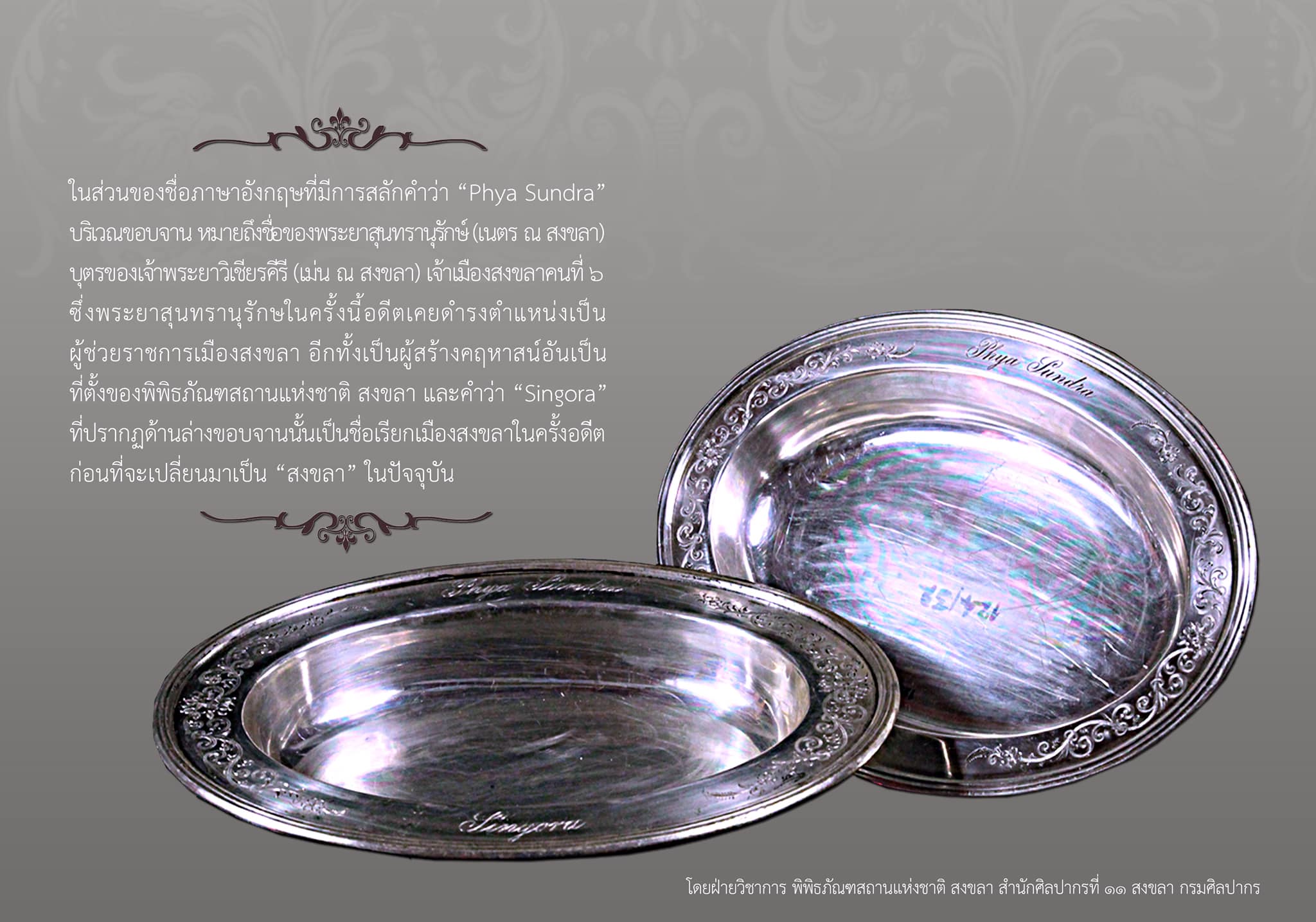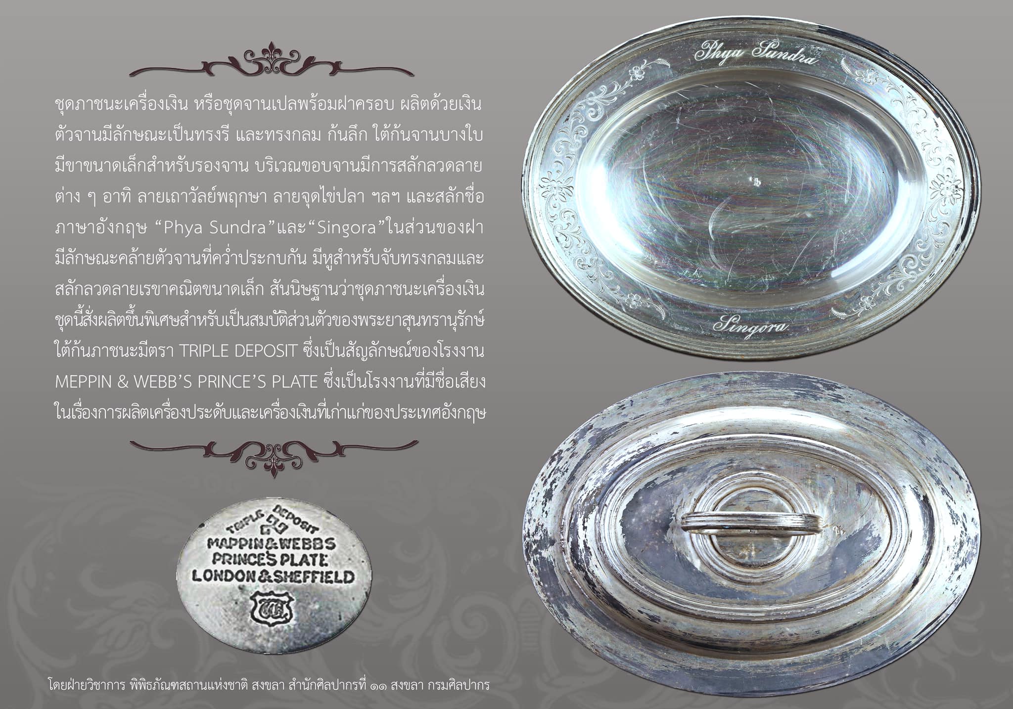 ชุดภาชนะเครื่องเงิน หรือชุดจานเปลพร้อมฝาครอบ ผลิตด้วยเงิน ตัวจานมีลักษณะเป็นทรงรี และทรงกลม ก้นลึก ใต้ก้นจานบางใบมีขาขนาดเล็กสำหรับรองจาน บริเวณขอบจานมีการสลัก ลวดลายต่าง ๆ อาทิ ลายเถาวัลย์พฤกษา ลายจุดไข่ปลา ฯลฯ และสลักชื่อภาษาอังกฤษ “Phya Sundra” และ “Singora” ในส่วนของฝามีลักษณะคล้ายตัวจานที่คว่ำประกบกัน มีหูสำหรับจับทรงกลม และสลักลวดลายเรขาคณิตขนาดเล็ก ใต้ภาชนะปรากฏตราสัญลักษณ์ “TRIPLE DEPOSIT”
