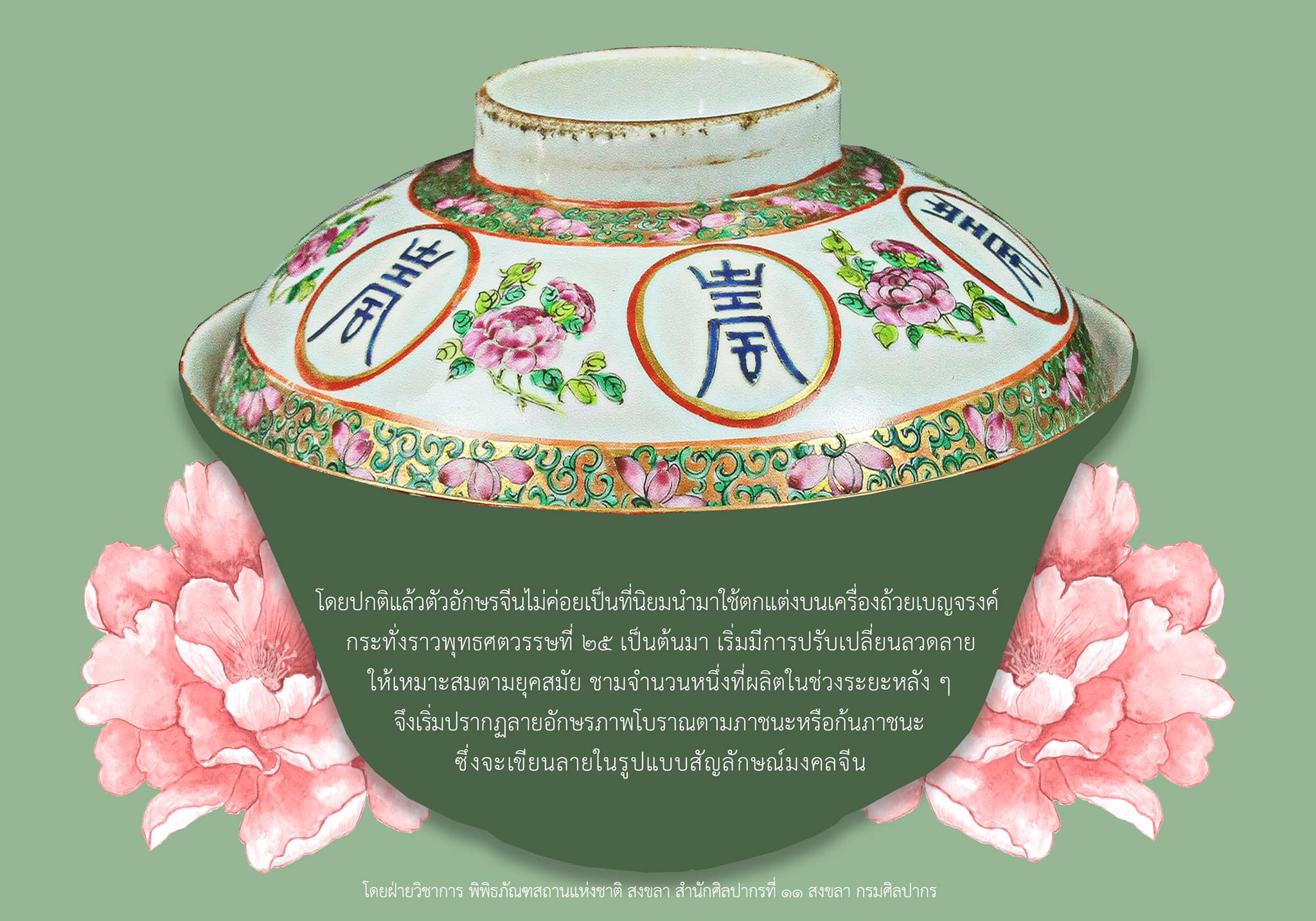 โดยปกติแล้วตัวอักษรจีนไม่ค่อยเป็นที่นิยมนำมาใช้ตกแต่งบนเครื่องถ้วยเบญจรงค์ กระทั่งราวพุทธศตวรรษที่ 25 เป็นต้นมา เริ่มมีการปรับเปลี่ยนลวดลายให้เหมาะสมตามยุคสมัย ชามจำนวนหนึ่งที่ผลิตในช่วงระยะหลัง ๆ จึงเริ่มปรากฏลายอักษรภาพโบราณตามภาชนะหรือก้นภาชนะ ซึ่งจะเขียนลายในรูปแบบสัญลักษณ์มงคลจีน