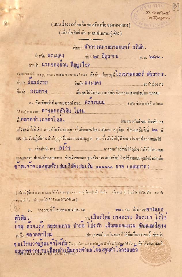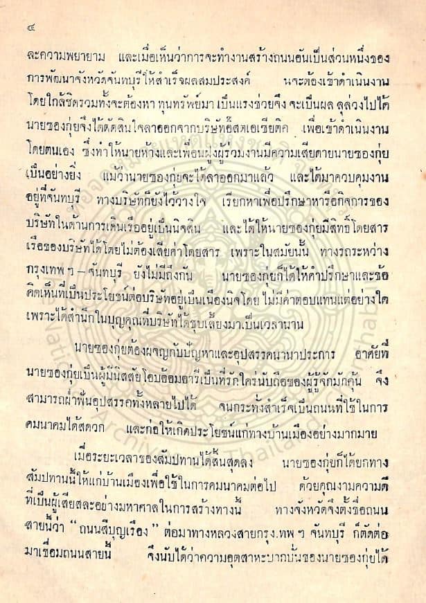 ...กำหนดถือสิทธิ 20 ปี นับแต่วันทำสัญญา โดยทุนตั้งบริษัทเป็นเงิน 100,000 บาท ลัษณะของถนนสายนี้ เป็นแบบถมดินและโรยกรวด...
