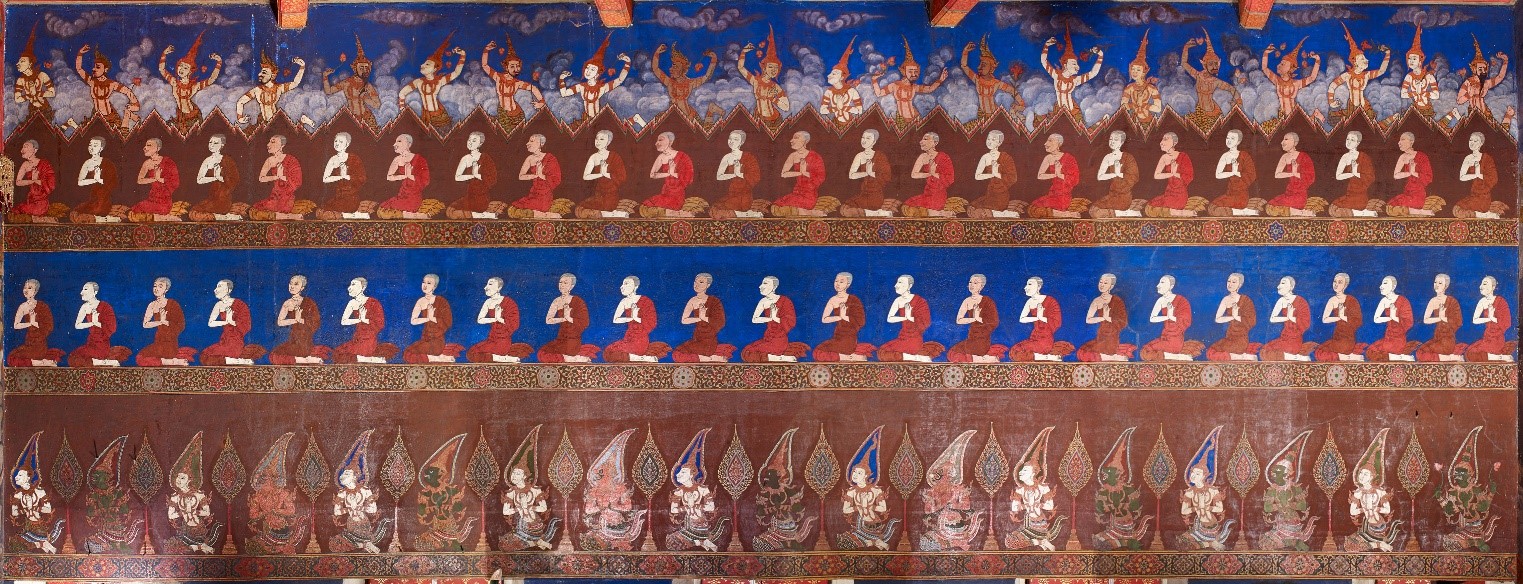 เหนือลายหน้ากระดานชั้นที่ ๒ และ ๓ ขึ้นไป เป็นภาพพระภิกษุถวายอัญชลี นั่งเรียงเป็นแถวในลักษณะภาพซ้ำอย่างเป็นระเบียบ ในชั้นที่ ๒ นี้ใช้พื้นหลังเป็นสีน้ำเงิน ส่วนชั้นที่ ๓ ใช้พื้นหลังเป็นสีน้ำตาล