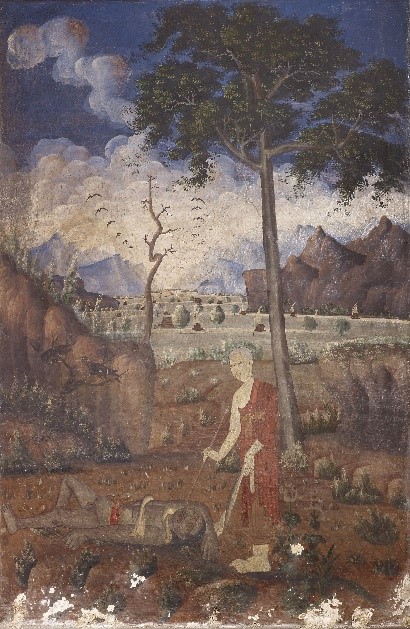 ภาพที่ ๒ ห้องภาพระหว่างบานประตูด้านหน้าพระประธาน ผนังด้านหลังพระประธานหรือผนังหุ้มกลองหลัง มีการแบ่งห้องภาพเช่นเดียวกับผนังด้านหน้าพระประธาน มีการใช้ลายหน้ากระดานแบ่งคั่น เช่นเดียวกัน โดยผนังด้านบนเขียนเรื่องไตรภูมิ ผนังด้านล่าง ผนังบริเวณฐานชุกชี เขียนเป็นภาพนรก สัตว์เปรต