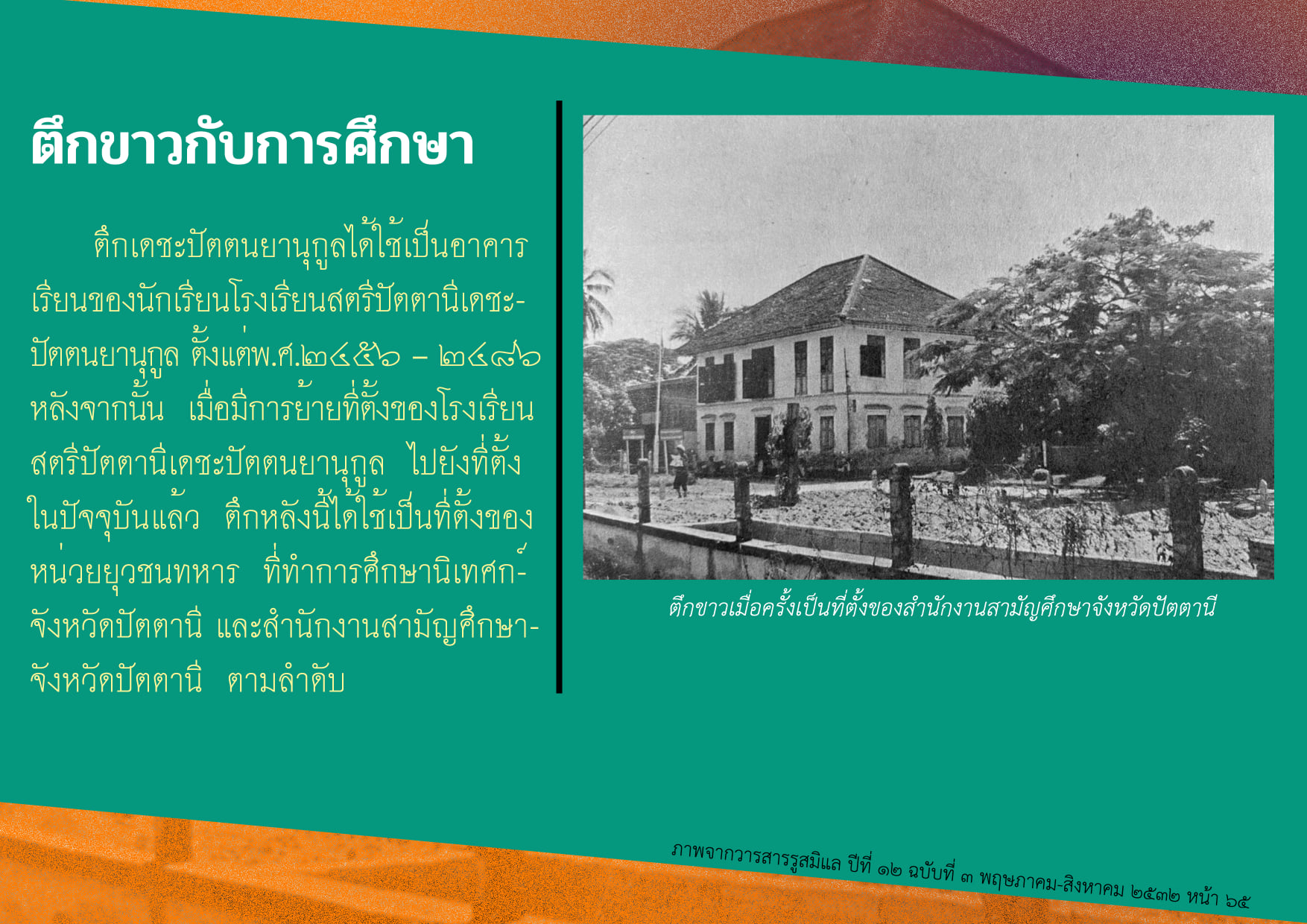 ตึกเดชะปัตตนยานุกูลได้ใช้เป็นอาคารเรียนของนักเรียนโรงเรียนสตรีปัตตานีเดชะปัตตนยานุกูล ตั้งแต่พ.ศ.๒๔๕๖ – ๒๔๘๖ หลังจากนั้นเมื่อมีการย้ายที่ตั้งของโรงเรียนสตรีปัตตานีเดชะปัตตนยานุกูล ไปยังที่ตั้งในปัจจุบันแล้ว ตึกหลังนี้ได้ใช้เป็นที่ตั้งของหน่วยยุวชนทหาร ที่ทำการศึกษานิเทศก์จังหวัดปัตตานี และสำนักงานสามัญศึกษาจังหวัดปัตตานี ตามลำดับ