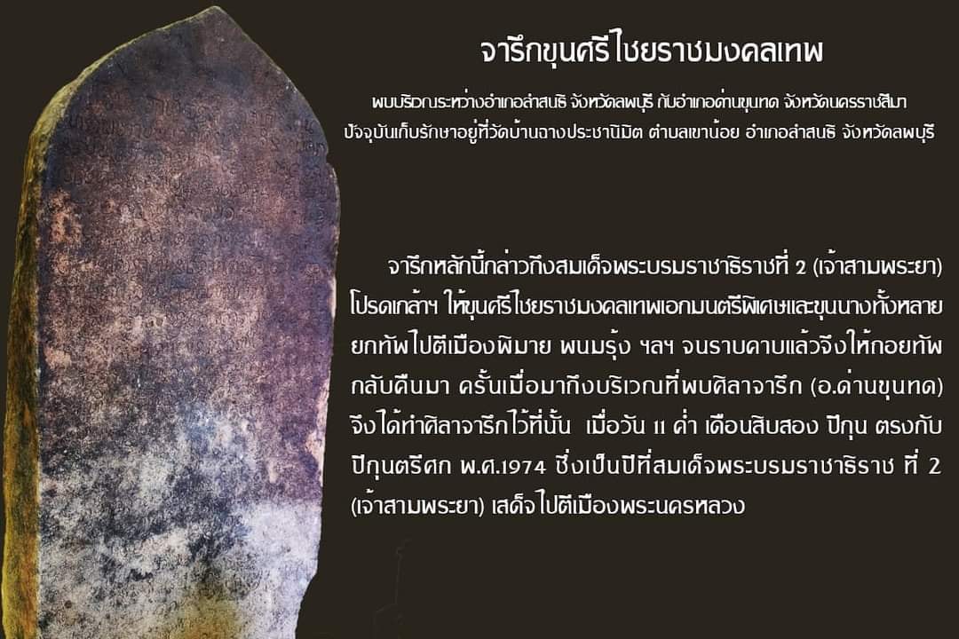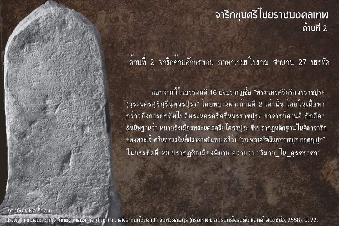 นอกจากจารึกวัดจงกอ แล้ว ในเขตพื้นที่อำเภอด่านขุดทด ยังพบจารึกอีกหลักหนึ่งที่เราไม่พูดถึงคงไม่ได้ นั่นคือ #จารึกขุนศรีไชยราชมงคลเทพ เดิมทีจารึกหลักนี้พบในเขตพื้นที่อำเภอด่านขุนทด จังหวัดนครราชสีมา พบอยู่กับไม่ไกลกับ #เหวตาบัว ซึ่งเป็นหนึ่งในช่องทางสัญจรธรรมชาติเชื่อมต่อระหว่างที่ราบภาคกลางกับที่ราบสูงโคราช โดยเป็นจารึกสำคัญที่แสดงความมีตัวตนของ #เมืองพิมาย และเมืองพนมรุ้ง ในช่วงกลางพุทธศตวรรษที่ 20 ว่ามิได้รกร้าง มีการอยู่อาศัย ต่อเนื่องเรื่อยมาตั้งแต่พุทธศตวรรษที่ 16 แม้แต่กรุงศรีอยุธยา ในช่วงเวลานั้น ก็รู้จักและมีความต้องที่จะขยายพระราชอำนาจเหนือเมืองพิมาย เเละเมืองพนมรุ้ง อีกด้วย