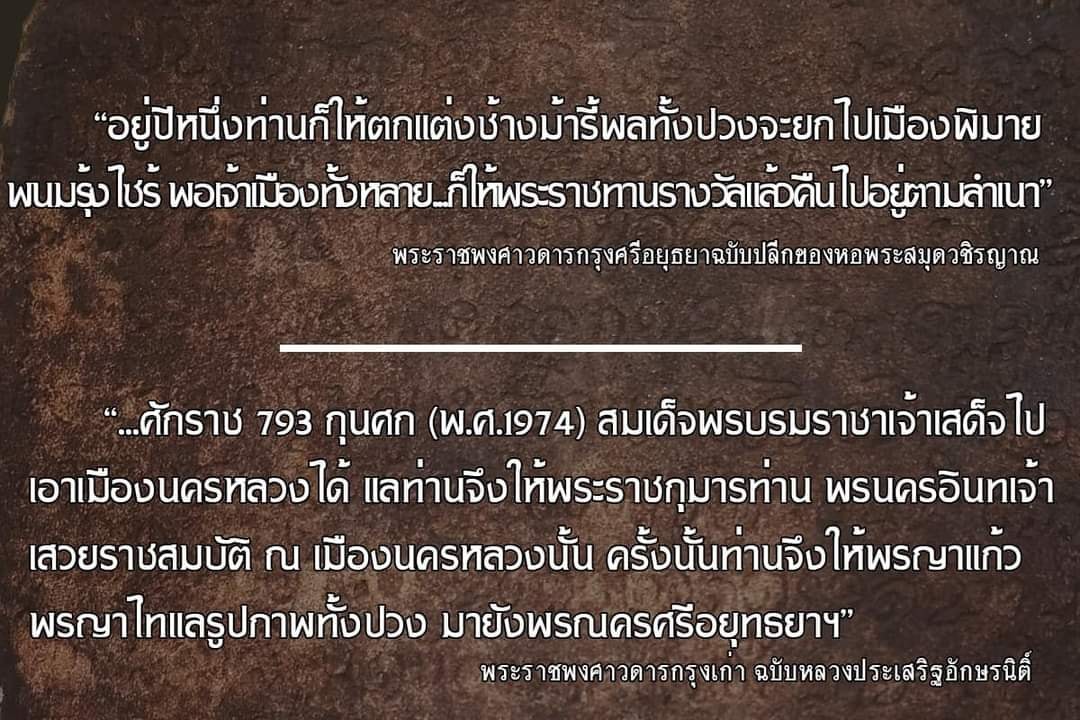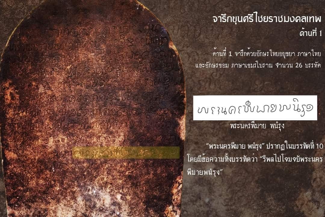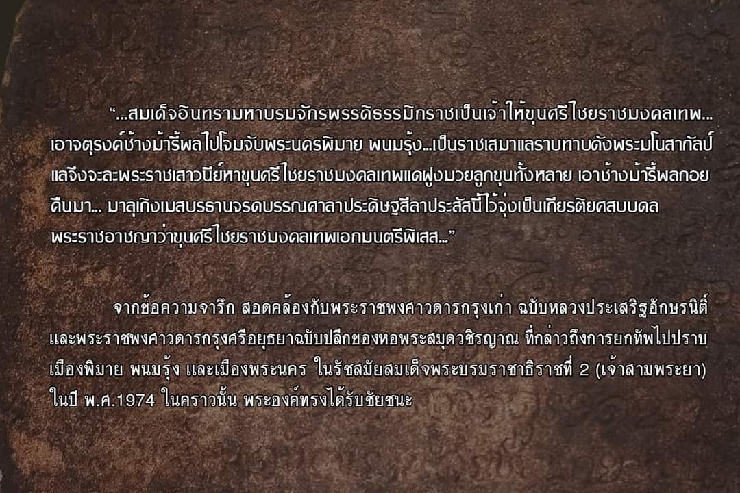 #ข้อความในจารึกกล่าวถึง สมเด็จพระบรมราชาธิราชที่ 2 (เจ้าสาทพระยา) โปรดให้ขุนศรีไชยราชมงคลเทพเอกมนตรีพิเศษและเหล่าขุนนาง ยกทัพไปตีเมืองพิมาย เมืองพนมรุ้ง และเมืองพระนคร ภายหลังได้รับชัยชนะจึงยกทัพกลับ สอดคล้องกับข้อความที่ปรากฏในพระราชพงศาวดารกรุงเก่า ฉบับหลวงประเสริฐอักษรนิติ์ และพระราชพงศาวดารกรุงศรีอยุธยาฉบับปลีกของหอสมุดวชิรญาณ ตรงกับปี พ.ศ.1974