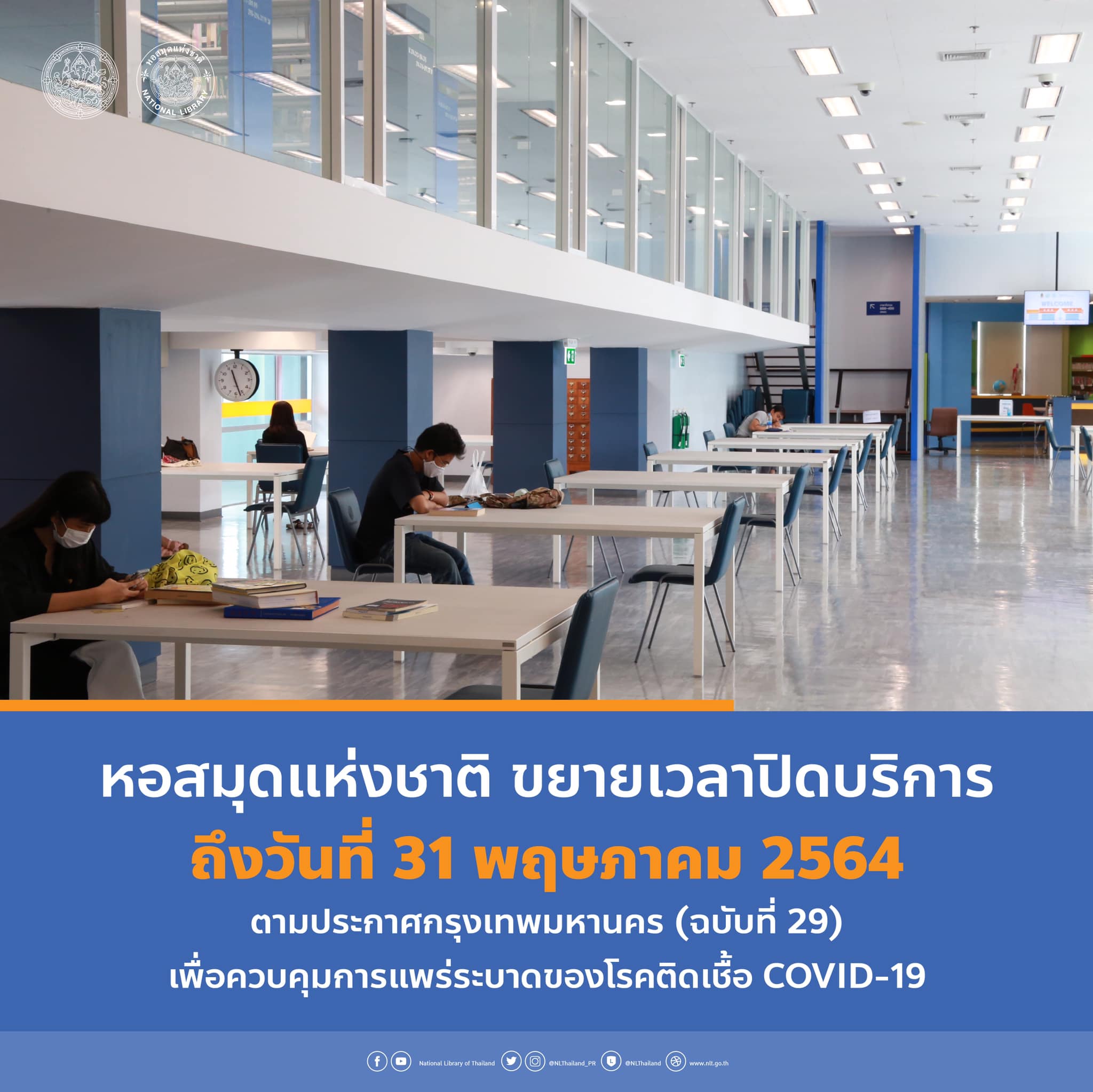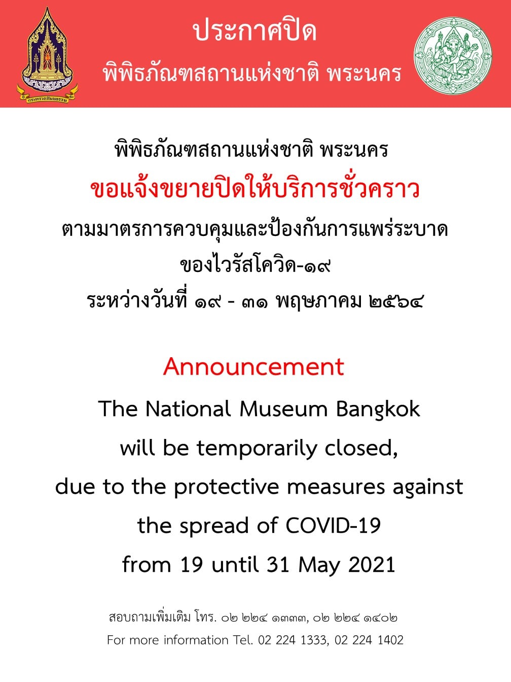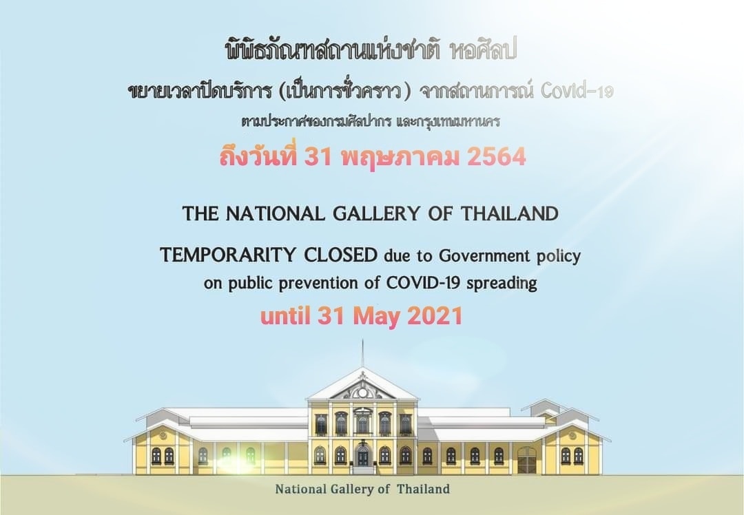 หอสมุดแห่งชาติ พิพิธภัณฑสถานแห่งชาติ พระนคร และพิพิธภัณฑสถานแห่งชาติ หอศิลป ประกาศขยายเวลาปิดบริการ ถึงวันที่ ๓๑ พฤษภาคม ๒๕๖๔ ตามประกาศกรุงเทพมหานคร (ฉบับที่ ๒๙) เพื่อควบคุมการแพร่ระบาดของโรคติดเชื้อ Covid-19