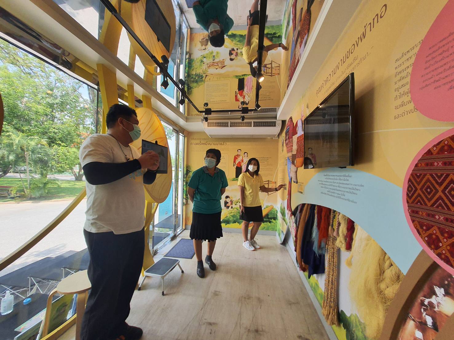 นิทรรศการมีเนื้อหาเกี่ยวกับการทรงงานด้านผ้าและประวัติการก่อตั้งมูลนิธิส่งเสริมศิลปาชีพ ในสมเด็จพระนางเจ้าสิริกิติ์ พระบรมราชินีนาถ ผ้าทอประเภทต่างๆ กระบวนการทอผ้า การปลูกหม่อนเลี้ยงไหม วงจรหนอนไหมและแมลงทับ สีธรรมชาติ และห้องสมุดเคลื่อนที่ ซึ่งกิจกรรมทั้งหมดนี้จะเดินทางไปจัดแสดง ณ แหล่งเรียนรู้ ๔๔ แห่งทั่วประเทศ