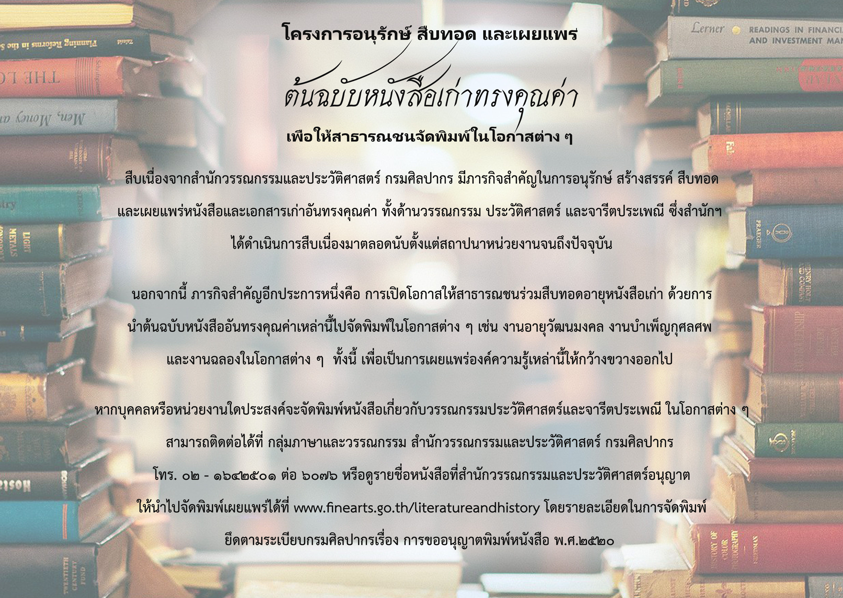 นายประทีป เพ็งตะโก อธิบดีกรมศิลปากร เปิดเผยว่า กรมศิลปากร โดยสำนักวรรณกรรมและ ประวัติศาสตร์ ได้จัดทำโครงการอนุรักษ์ สืบทอด และเผยแพร่ต้นฉบับหนังสือเก่าทรงคุณค่า เพื่อให้สาธารณชนนำไปจัดพิมพ์เผยแพร่ในโอกาสต่าง ๆ บุคคลหรือหน่วยงานใดประสงค์จะจัดพิมพ์หนังสือเกี่ยวกับวรรณกรรม ประวัติศาสตร์ และจารีตประเพณี สามารถติดต่อได้ที่ กลุ่มภาษาและวรรณกรรม สำนักวรรณกรรมและประวัติศาสตร์ กรมศิลปากร โทร. ๐ ๒๑๖๔ ๒๕๐๑ ต่อ ๖๐๗๖ หรือดูรายชื่อหนังสือที่อนุญาตให้นำไปจัดพิมพ์เผยแพร่ได้ที่ www.finearts.go.th/literatureandhistory