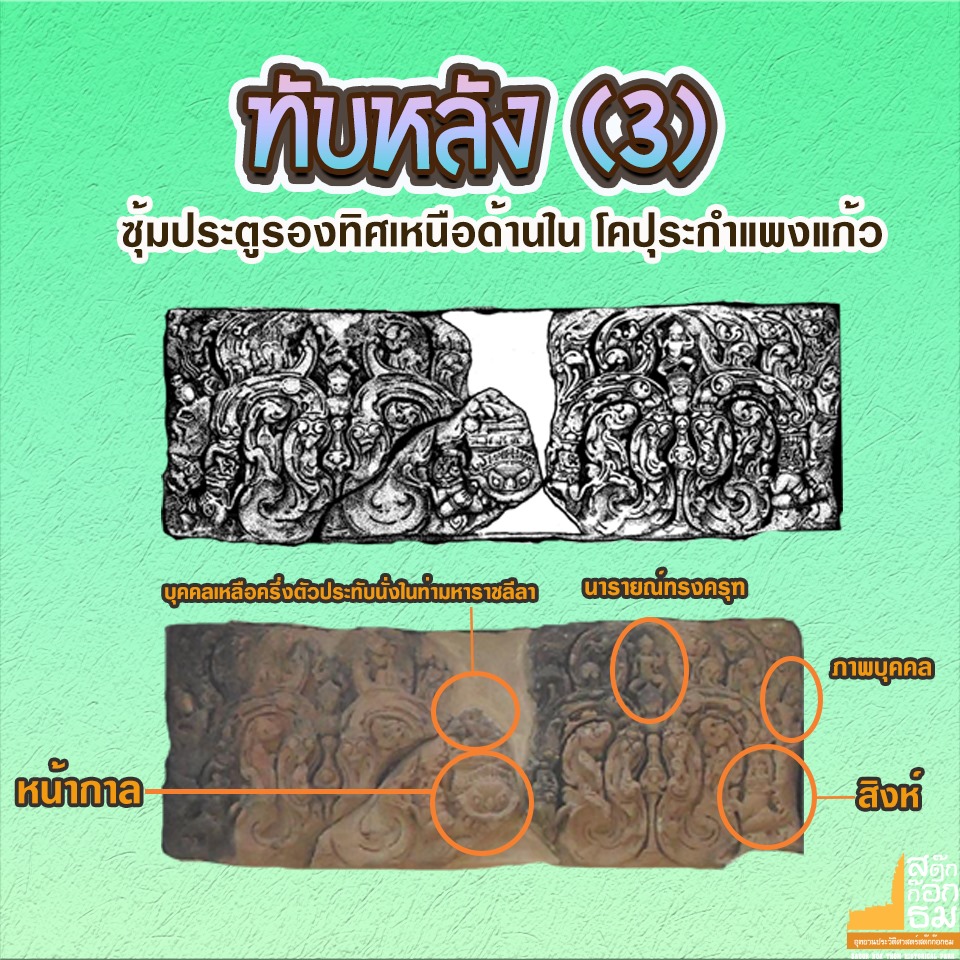 ทับหลังชิ้นที่โดดเด่น ชิ้นที่ ๓ ซุ้มประตูรองทิศเหนือด้านใน โคปุระกำแพงแก้ว ของปราสาทสด๊กก๊อกธม จังหวัดสระแก้ว สภาพของทับหลังคงเหลือภาพสลักเกือบสมบูรณ์ โดยสลักเป็นภาพบุคคลที่คงเหลือเฉพาะครึ่งตัวด้านล่างประทับนั่งในท่ามหาราชลีลาสนะ(มหาราชลีลา)เหนือฐานบัวที่ตั้งอยู่บนหน้ากาลซึ่งคล้อยต่ำลงมาจนถึงขอบล่างสุดของทับหลัง หน้ากาลใช้มือทั้งสองจับท่อนพวงมาลัยที่คายออกมา ท่อนพวงมาลัยโค้งขึ้นจนเกือบกึ่งกลางของทับหลัง และตกลงมาที่ปลายทับหลังทั้งสองด้านซึ่งปรากฏรูปสัตว์สันนิษฐานว่าเป็นสิงห์ หันหน้าเข้าหาจุดกึ่งกลางของทับหลัง ตรงกลางของท่อนพวงมาลัยทั้งสองด้านถูกแบ่งครึ่งโดยเฟื่องอุบะที่ด้านบนมีพระนารายณ์ทรงครุฑหรือพระนารายณ์ทรงสุบรรณ ด้านล่างของท่อนพวงมาลัยประดับลายใบไม้ม้วน ด้านบนของท่อนพวงมาลัยประดับลายใบไม้