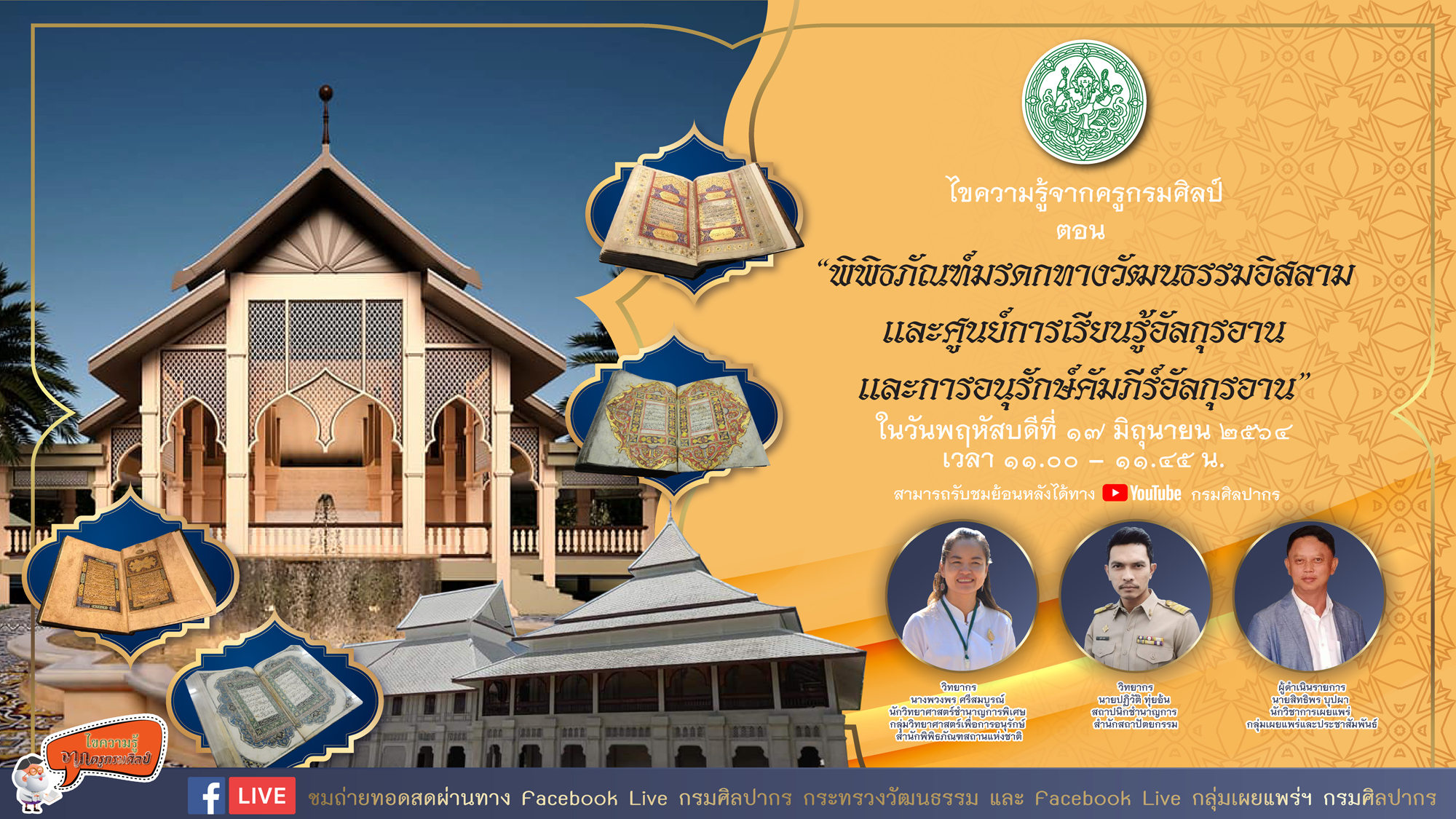ขอเชิญรับชม Facebook Live รายการ ไขความรู้จากครูกรมศิลป์ ตอน พิพิธภัณฑ์มรดกทางวัฒนธรรมอิสลามฯ
