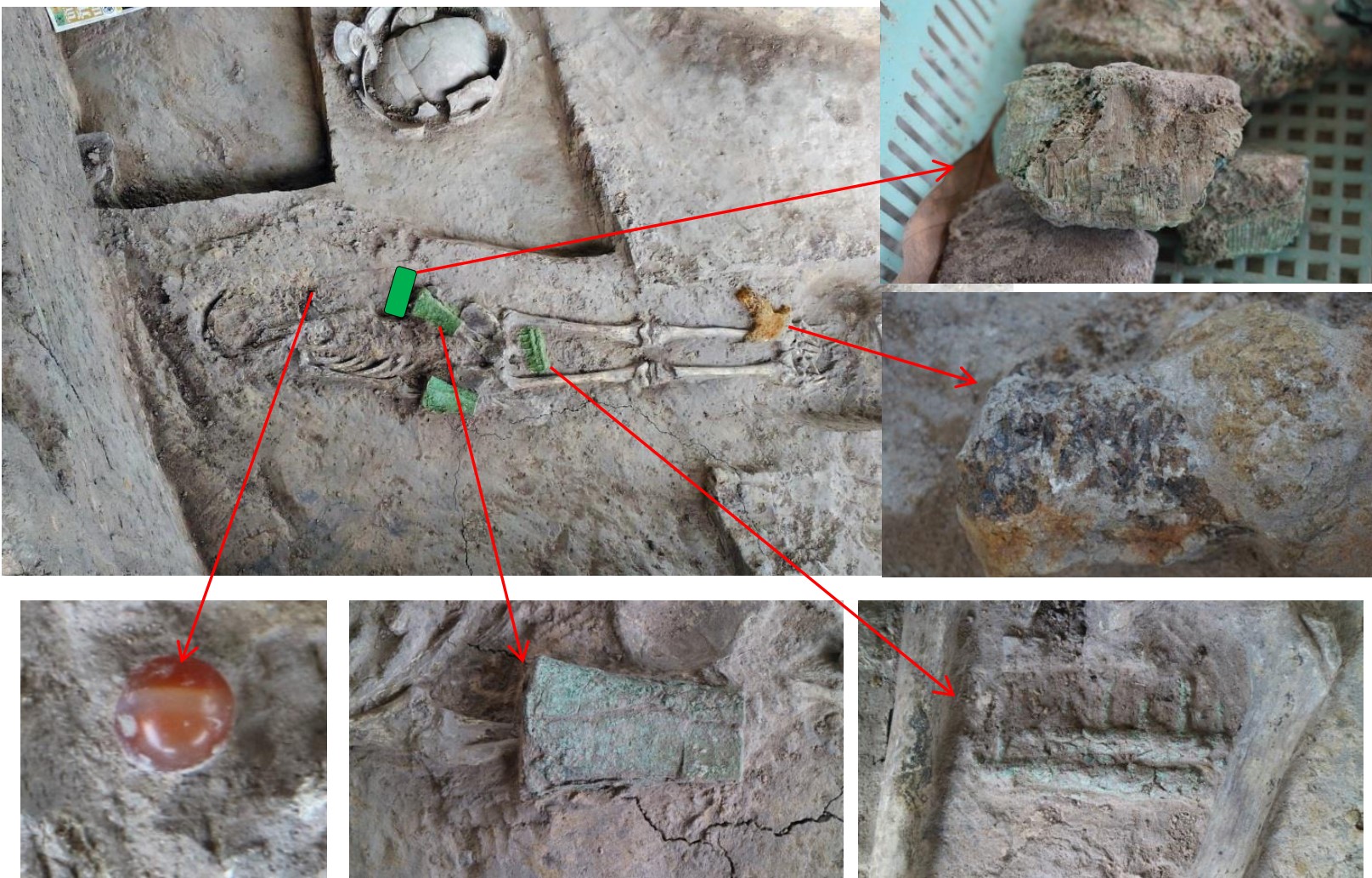 หลักฐานที่พบร่วม ได้แก่ กำไลสำริดทรงแบน และลูกปัดสีเหลืองปนส้มไส้ในเป็นสีแดงกระจายอยู่ที่ส่วนอก และชิ้นส่วนกระดูกสัตว์ ท่อนยาว(Long Bone) วางทับหน้าแข้งซ้าย