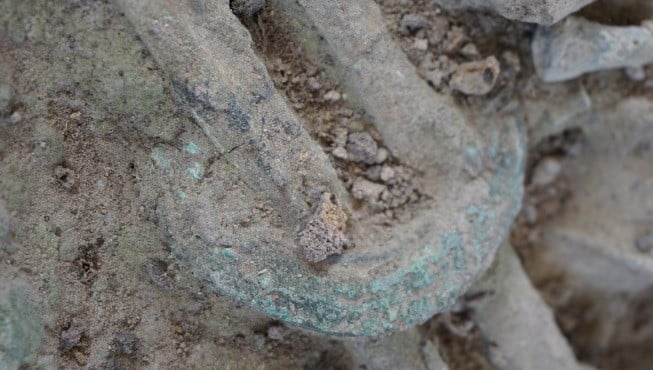 หลักฐานที่พบร่วม ได้แก่ กำไลสำริดที่แขนซ้ายท่อนบนมีเครื่องจักสานติดอยู่ ขวานเหล็กมีรอยประทับเปลือกข้าว ลูกปัดหินคาร์เนเลียนทรงกลมบริเวณคอฝั่งซ้าย กำไลทรงกระบอกที่แขนท่อนล่างสองข้าง และเครื่องรางสำริดมีลักษณะคล้ายหวีแต่ซี่ห่างกว่าสองชิ้นที่ระหว่างขาท่อนบน
