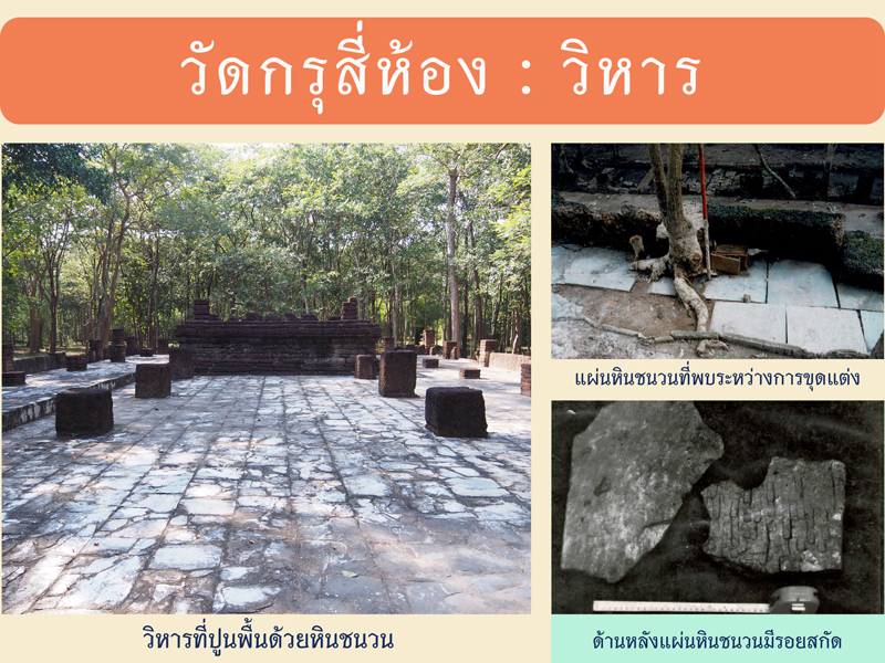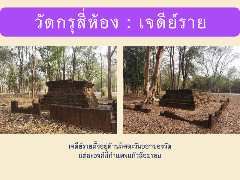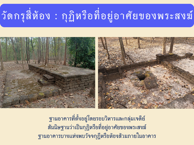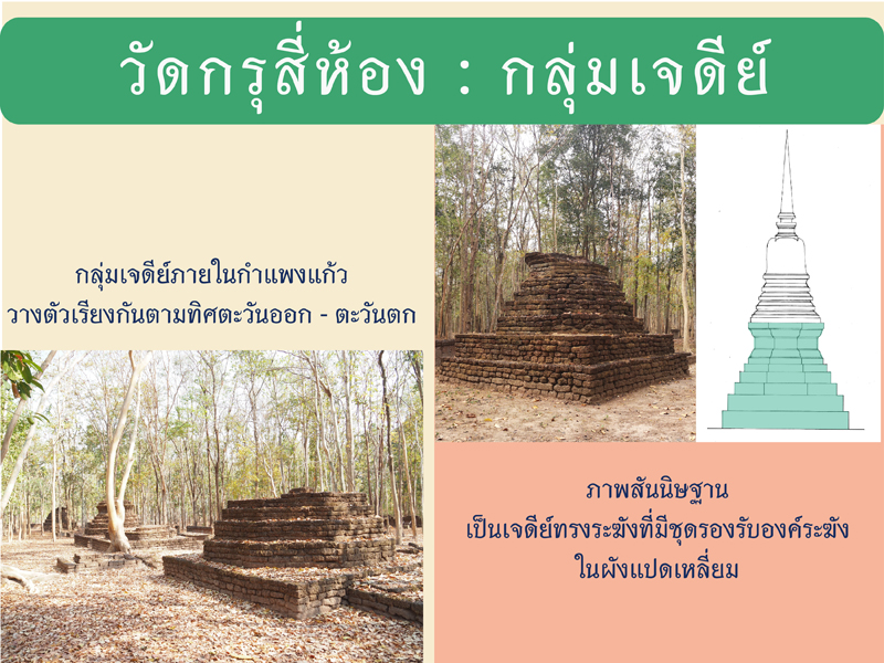 ๑. เขตพุทธาวาส พบโบราณสถานหลัก ได้แก่ วิหารโถงขนาด ๗ ห้อง อยู่บริเวณกึ่งกลางของวัด ตั้งอยู่บนฐานสูง มีลักษณะพิเศษคือการพบร่องรอยการใช้แผ่นหินชนวนปูบนพื้นของวิหาร ด้านทิศตะวันออกของวิหารพบกลุ่มเจดีย์จำนวน ๗ องค์ เรียงตัวกันในแนวทิศตะวันออก–ตะวันตก ซึ่งกลุ่มเจดีย์ดังกล่าวมีรูปแบบสถาปัตยกรรมและขนาดของฐานเจดีย์มีความแตกต่างกันออกไปในแต่ละองค์ เจดีย์บางองค์สามารถสันนิษฐานได้เบื้องต้นว่าเป็นเจดีย์ที่มีชุดรองรับองค์ระฆังในผังแปดเหลี่ยมที่จัดว่าเป็นรูปแบบสกุลช่างกำแพงเพชรที่ปรากฏในเมืองกำแพงเพชร เช่น เจดีย์ประธานวัดพระนอน เจดีย์ประธานวัดพระธาตุ เจดีย์ประธานวัดป่าแฝก โดยโบราณสถานหลักทั้งสองมีกำแพงแก้วล้อมรอบแสดงเขตพุทธาวาสอย่างชัดเจน แต่แนวกำแพงแก้วที่พบได้แบ่งโบราณสถานทั้งสองออกจากกัน ไม่ได้ล้อมรอบวิหารและกลุ่มเจดีย์ให้เป็นพื้นที่หนึ่งเดียวกัน ซึ่งลักษณะการวางแผนผังที่วัดกรุสี่ห้องมีความแตกต่างจากโบราณสถานทั่วไปในเมืองกำแพงเพชร