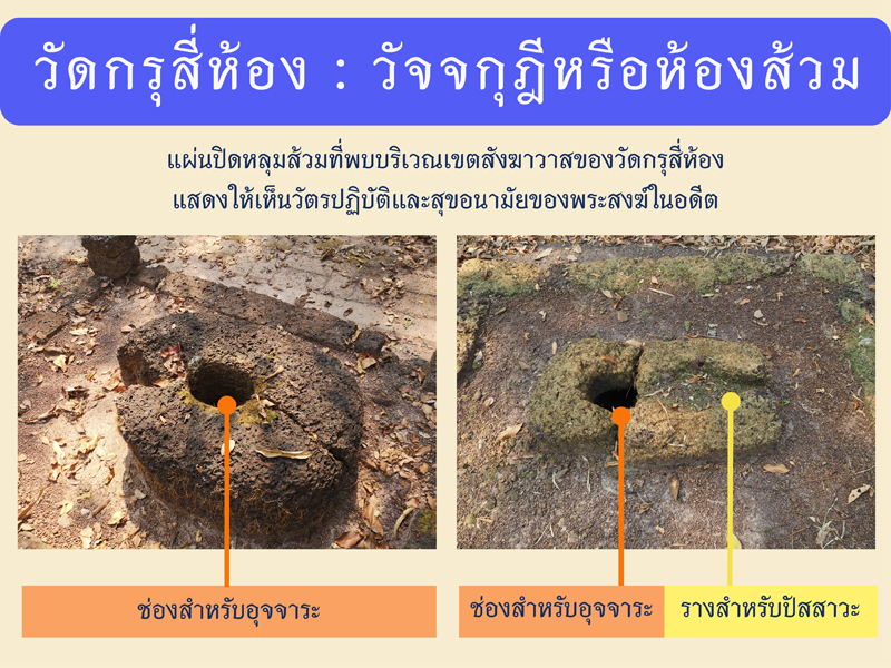 ๒. เขตสังฆาวาส ส่วนสิ่งก่อสร้างในเขตสังฆาวาสตั้งกระจายตัวอยู่ทางด้านทิศเหนือ ทิศใต้ และทิศตะวันตกหรือบริเวณโดยรอบของโบราณสถานหลักทั้งสอง ประกอบด้วย กุฏิและศาลารวม ๑๐ หลัง วัจจกุฎีหรือห้องส้วม (นับรวมที่พบภายในกุฏิ) จำนวน ๑๐ แห่ง บ่อน้ำ ๔ แห่ง
