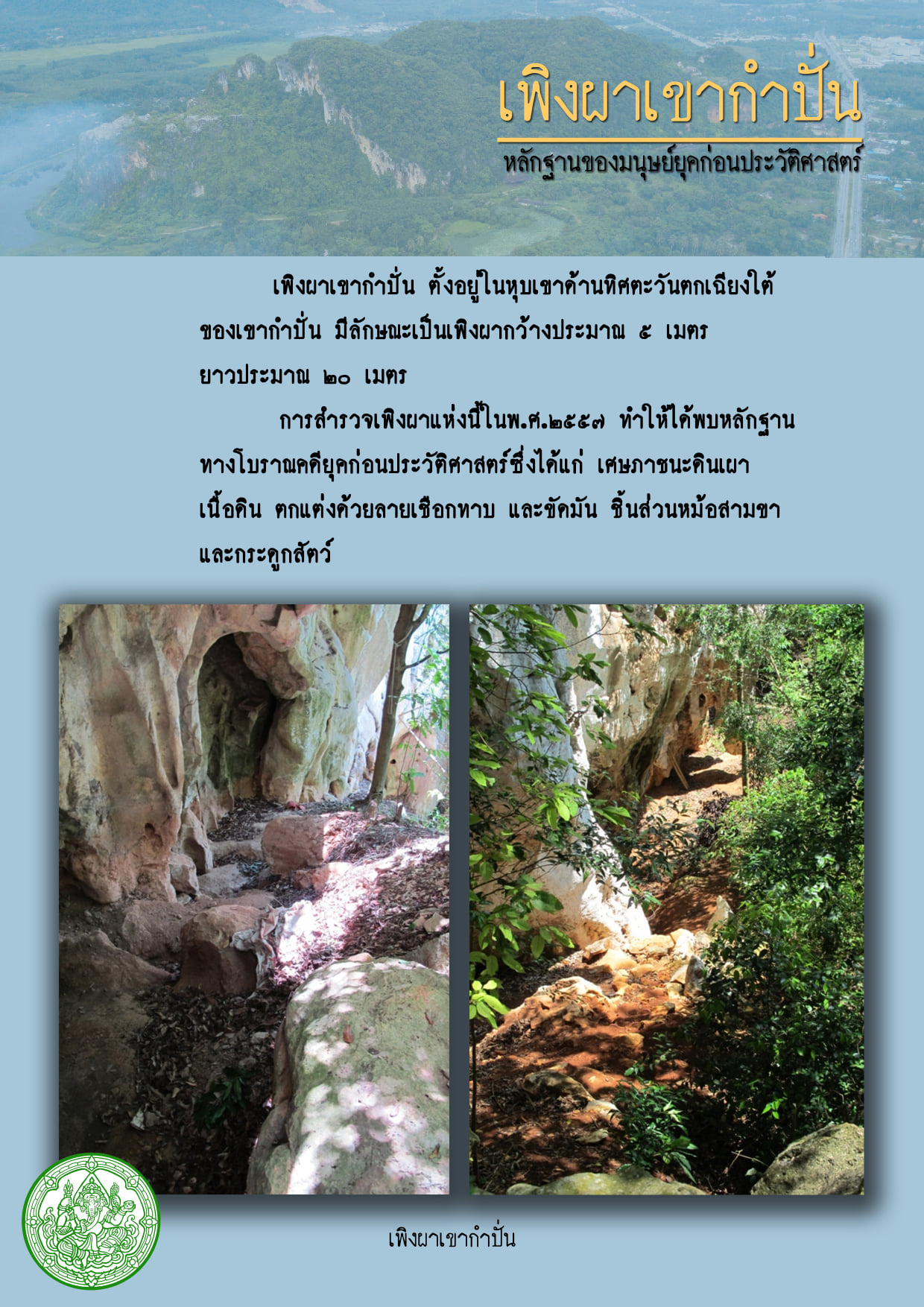 ....... สวัสดีค่ะ กลับมาพบกลับกลุ่มโบราณคดีสำนักศิลปากรที่ ๑๑ สงขลา ในสัปดาห์นี้ทางกลุ่มฯจะนำทุกท่านไปทำความรู้จักเกี่ยวกับเขากำปั่นในยุคก่อนประวัติศาสตร์กันค่ะ ........