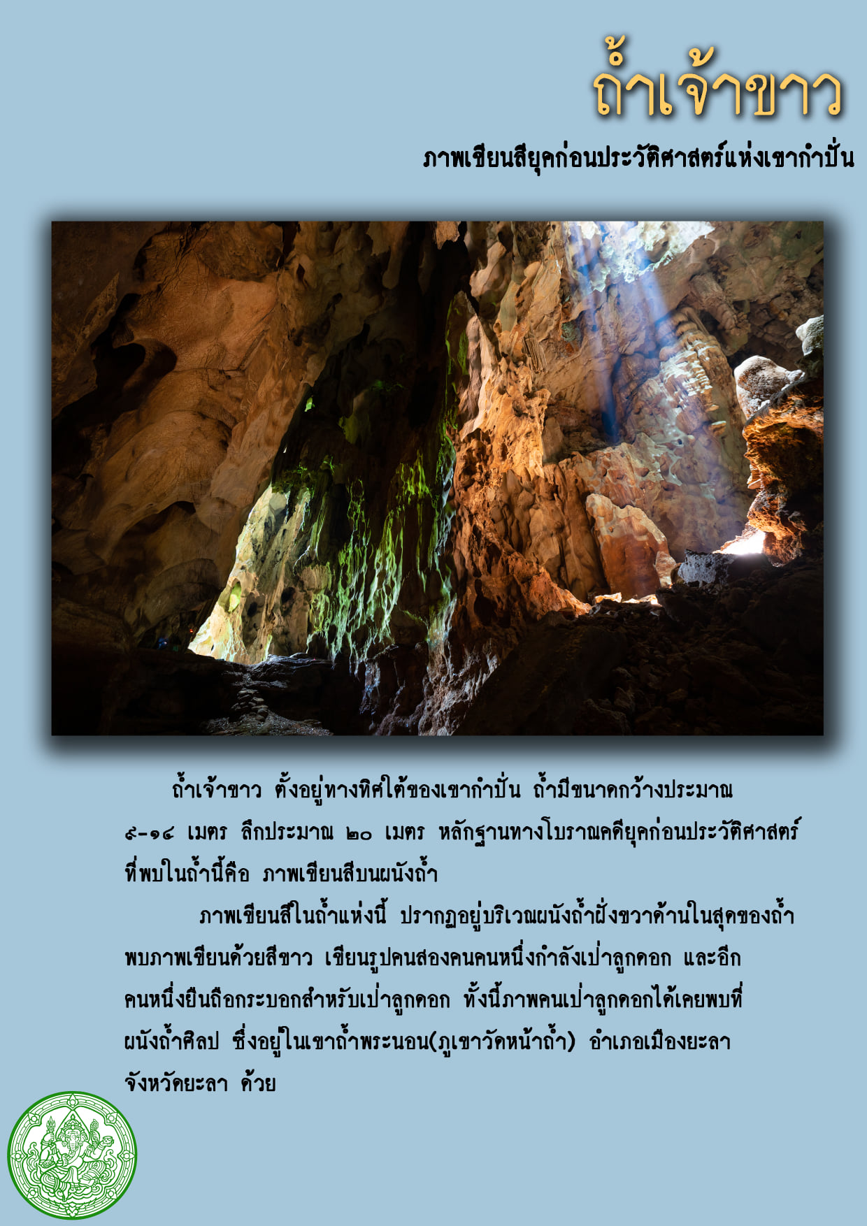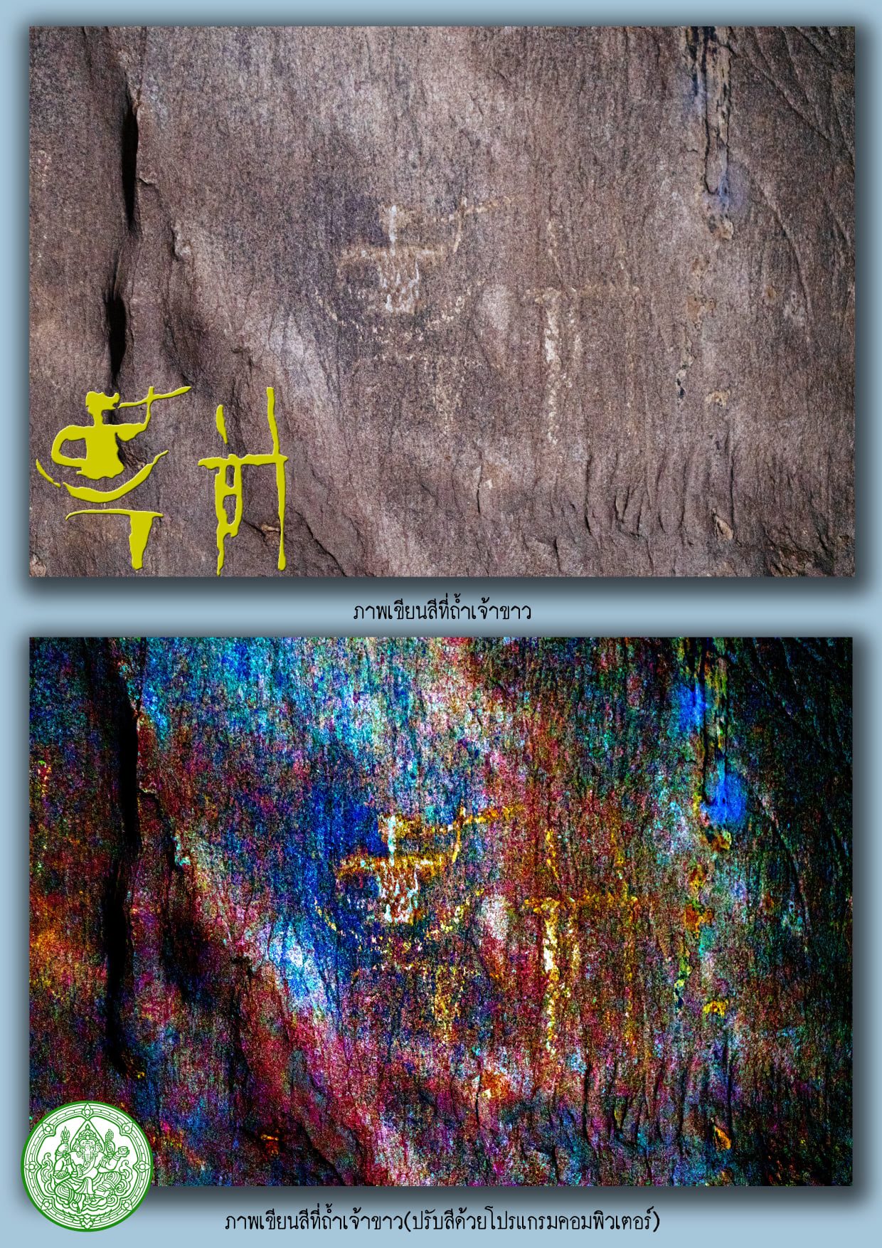 ที่ถ้ำเจ้าขาว บริเวณผนังถ้ำฝั่งขวาด้านในสุดของถ้ำ พบภาพเขียนด้วยสีขาว เขียนรูปคนสองคน