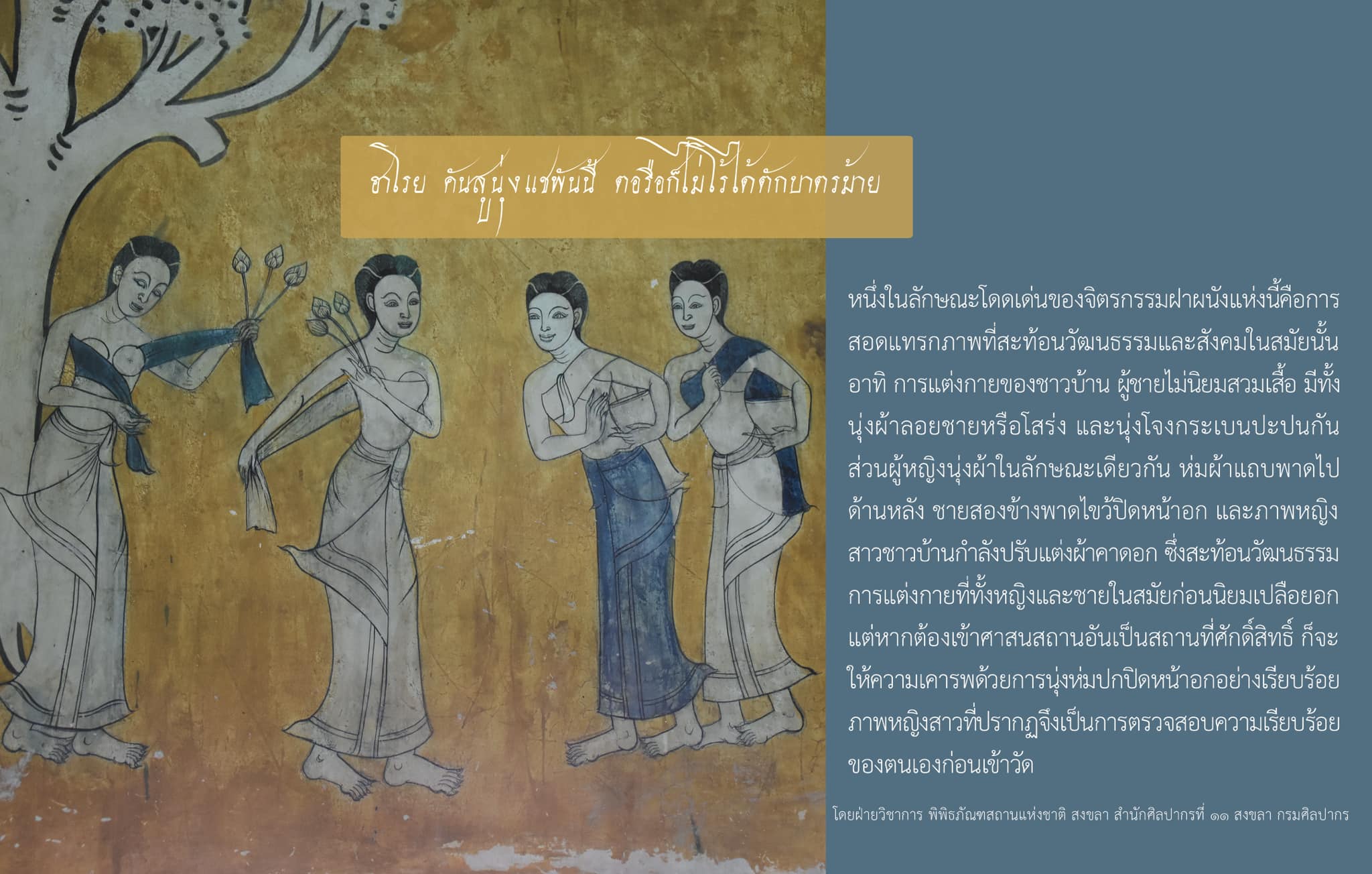 ภาพที่พิพิธภัณฑสถานแห่งชาติ สงขลา นำมาใช้ประชาสัมพันธ์ เป็นภาพจำลองมาจากจิตรกรรมฝาผนังภายในวิหารพระพุทธไสยาสน์ หรือวิหารพ่อเฒ่านอน วัดจะทิ้งพระ อำเภอสทิงพระ จังหวัดสงขลา