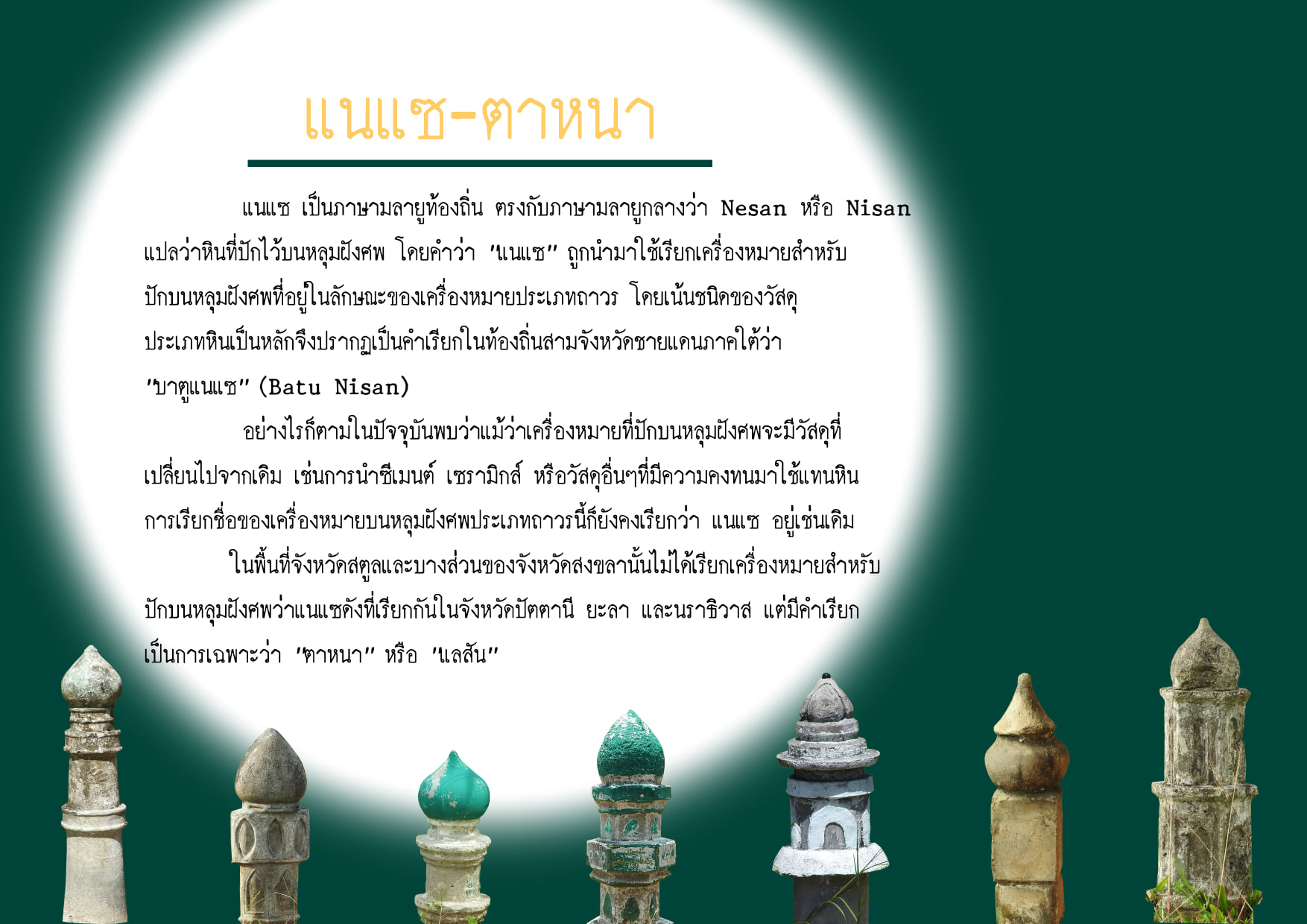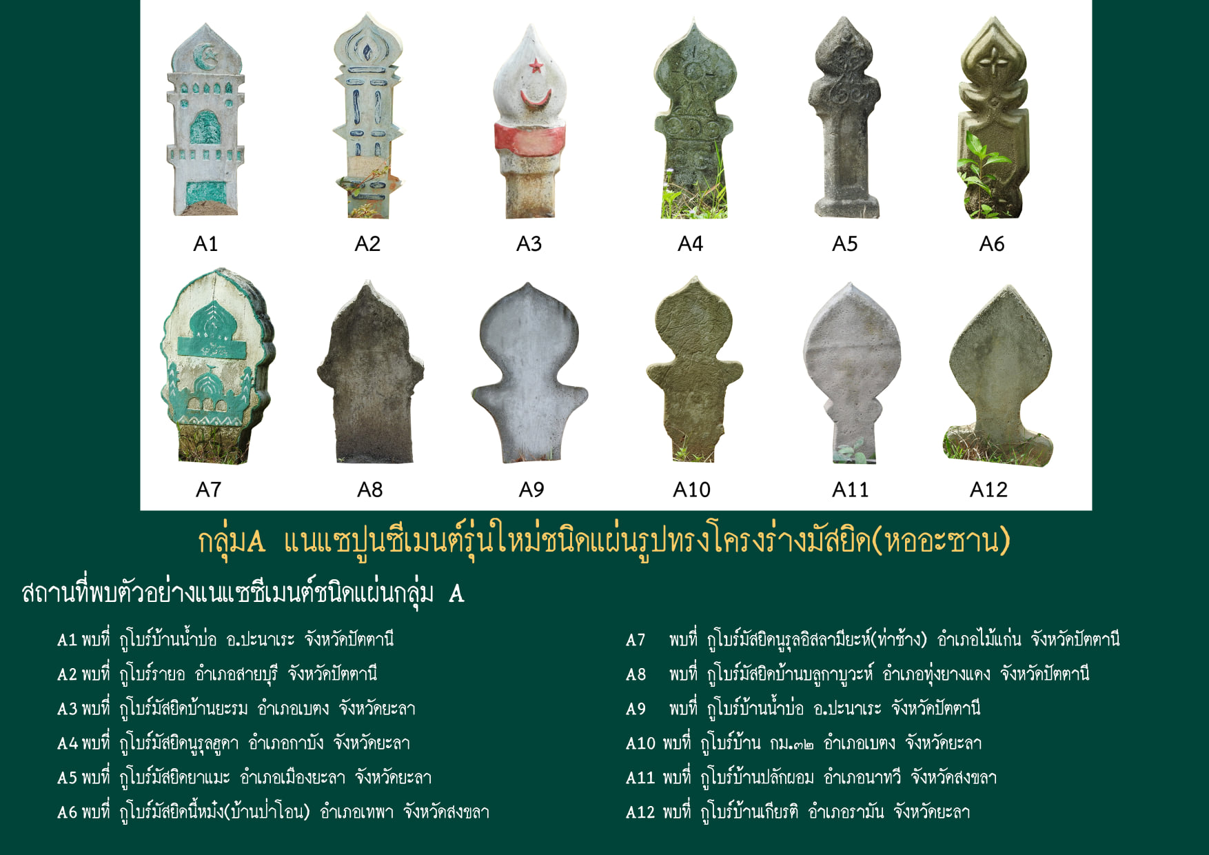 ข้อมูลจัดทำโดย นายสารัท ชลอสันติสกุล นักโบราณคดีชำนาญการ สำนักศิลปากรที่ ๑๑ สงขลา โดยเรียบเรียงจาก รายงานองค์ความรู้จากหลุมฝังศพ(กูโบร์)ในพื้นที่ ๕ จังหวัดชายแดนภาคใต้