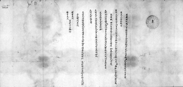 หลังจากตั้งราชธานีที่กรุงธนบุรีศรีมหาสมุทรแล้ว สมเด็จพระเจ้าตากสินมหาราชได้ส่งพระราชสาสน์ไปเมืองจีนเพื่อถวายพระเจ้าเฉียนหลงจักรพรรดิจีนเพื่อให้รับรองฐานะกษัตริย์พระองค์ใหม่ โดยส่งพระราชสาสน์ไปกับเรือสินค้าของพ่อค้าจีน ชื่อ หยังจิ้นจง เนื้อความในพระราชสาสน์อธิบายการขึ้นครองราชย์ของพระองค์ พร้อมทั้งขอพระราชทานพระบรมราชานุญาตซื้อเหล็กและปืนใหญ่มาทำสงครามกับพม่า แต่ในปีเดียวกันหัวหน้าชุมนุมต่างๆ ที่ตั้งตัวเป็นอิสระก็ได้ส่งพระราชสาสน์ไปถวายพระเจ้าเฉียนหลงเพื่อให้ทรงรับรองฐานะการเป็นกษัตริย์ของสยามด้วยเช่นกัน ครั้งนั้น พระเจ้าเฉียนหลงจึงได้ตอบปฏิเสธการรับรองฐานะของสมเด็จพระเจ้าตากสินมหาราช รวมทั้งปฏิเสธการขอซื้อเหล็กและปืนใหญ่ด้วย(๘)