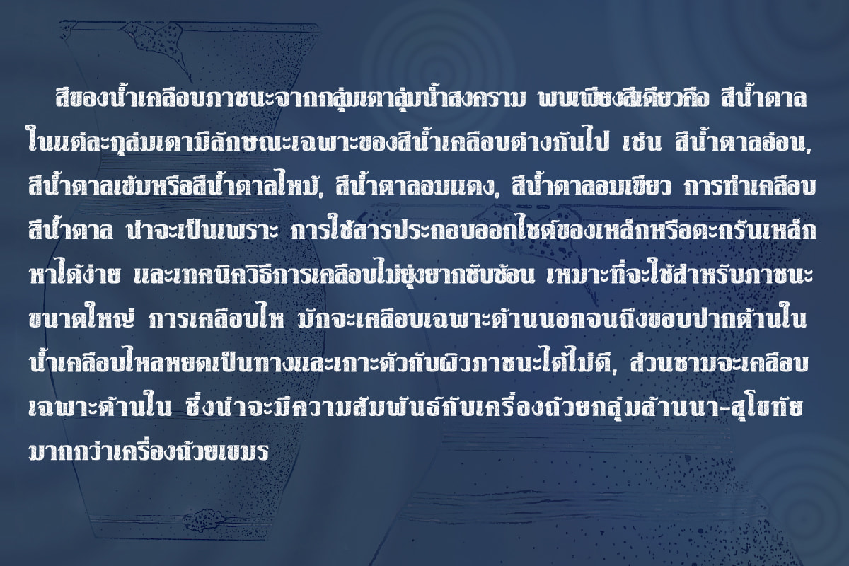 สีของน้ำเคลือบภาชนะจากกลุ่มเตาลุ่มน้ำสงคราม พบเพียงสีเดียวคือ สีน้ำตาล ในแต่ละกุล่มเตามีลักษณะเฉพาะของสีน้ำเคลือบต่างกันไป เช่น สีน้ำตาลอ่อน, สีน้ำตาลเข้มหรือสีน้ำตาลไหม้, สีน้ำตาลอมแดง, สีน้ำตาลอมเขียว การทำเคลือบสีน้ำตาล น่าจะเป็นเพราะ การใช้สารประกอบออกไซด์ของเหล็กหรือตะกรันเหล็กหาได้ง่าย และเทคนิควิธีการเคลือบไม่ยุ่งยากซับซ้อน เหมาะที่จะใช้สำหรับภาชนะขนาดใหญ่ การเคลือบไห มักจะเคลือบเฉพาะด้านนอกจนถึงขอบปากด้านใน น้ำเคลือบไหลหยดเป็นทางและเกาะตัวกับผิวภาชนะได้ไม่ดี, ส่วนชามจะเคลือบเฉพาะด้านใน ซึ่งน่าจะมีความสัมพันธ์กับเครื่องถ้วยกลุ่มล้านนา-สุโขทัย มากกว่าเครื่องถ้วยเขมร