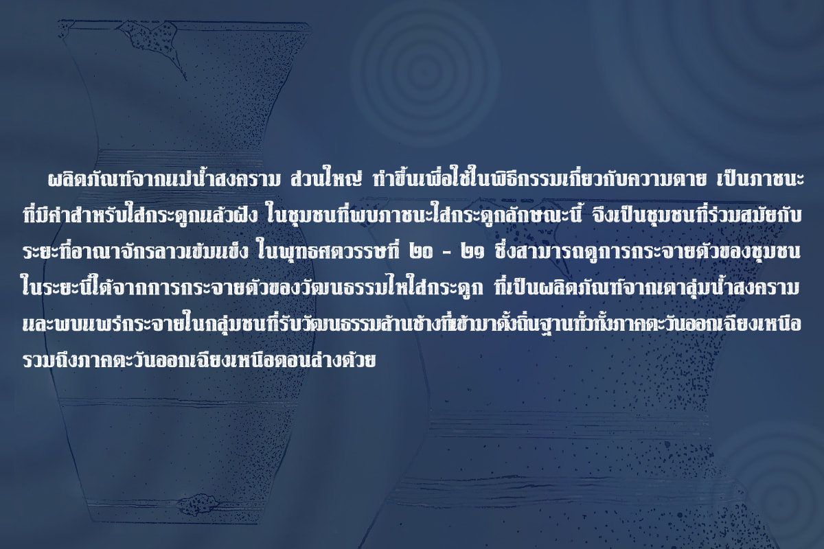 ผลิตภัณฑ์จากแม่น้ำสงคราม ส่วนใหญ่ ทำขึ้นเพื่อใช้ในพิธีกรรมเกี่ยวกับความตาย เป็นภาชนะที่มีค่า สำหรับใส่กระดูกแล้วฝัง ในชุมชนที่พบภาชนะใส่กระดูกลักษณะนี้ จึงเป็นชุมชนที่ร่วมสมัยกับระยะที่อาณาจักรลาวเข้มแข็ง ในพุทธศตวรรษที่ 20-21 ซึ่งสามารถดูการกระจายตัวของชุมชนในระยะนี้ได้จาก การกระจายตัวของวัฒนธรรมไหใส่กระดูก ที่เป็นผลิตภัณฑ์จากเตาลุ่มน้ำสงคราม และพบแพร่กระจายในกลุ่มชนที่รับวัฒนธรรมล้านช้าง ที่เข้ามาตั้งถิ่นฐานทั่วทั้งภาคตะวันออกเฉียงเหนือ รวมถึงภาคตะวันออกเฉียงเหนือตอนล่างด้วย
