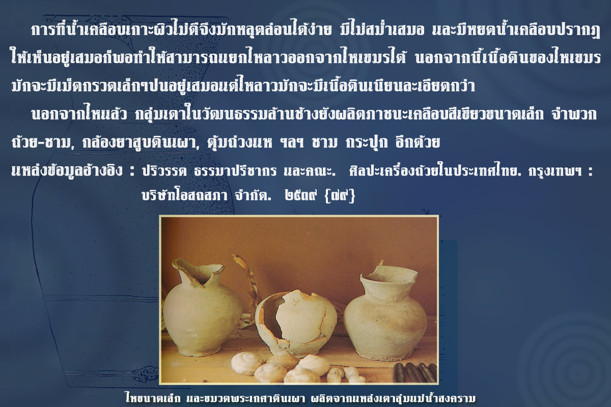 การที่น้ำเคลือบเกาะผิวไม่ดีจึงมักหลุดล่อนได้ง่าย มีไม่สม่ำเสมอ และมีหยดน้ำเคลือบปรากฏให้เห็นอยู่เสมอก็พอทำให้สามารถแยกไหลาวออกจากไหเขมรได้ นอกจากนี้เนื้อดินของไหเขมรมักจะมีเม็ดกรวดเล็กๆปนอยู่เสมอแต่ไหลาวมักจะมีเนื้อดินเนียนละเอียดกว่า นอกจากไหแล้ว กลุ่มเตาในวัฒนธรรมล้านช้างยังผลิตภาชนะเคลือบสีเขียวขนาดเล็ก จำพวก ถ้วย-ชาม , กล้องยาสูบดินเผา, ตุ้มถ่วงแห ฯลฯ ชาม กระปุก อีกด้วย