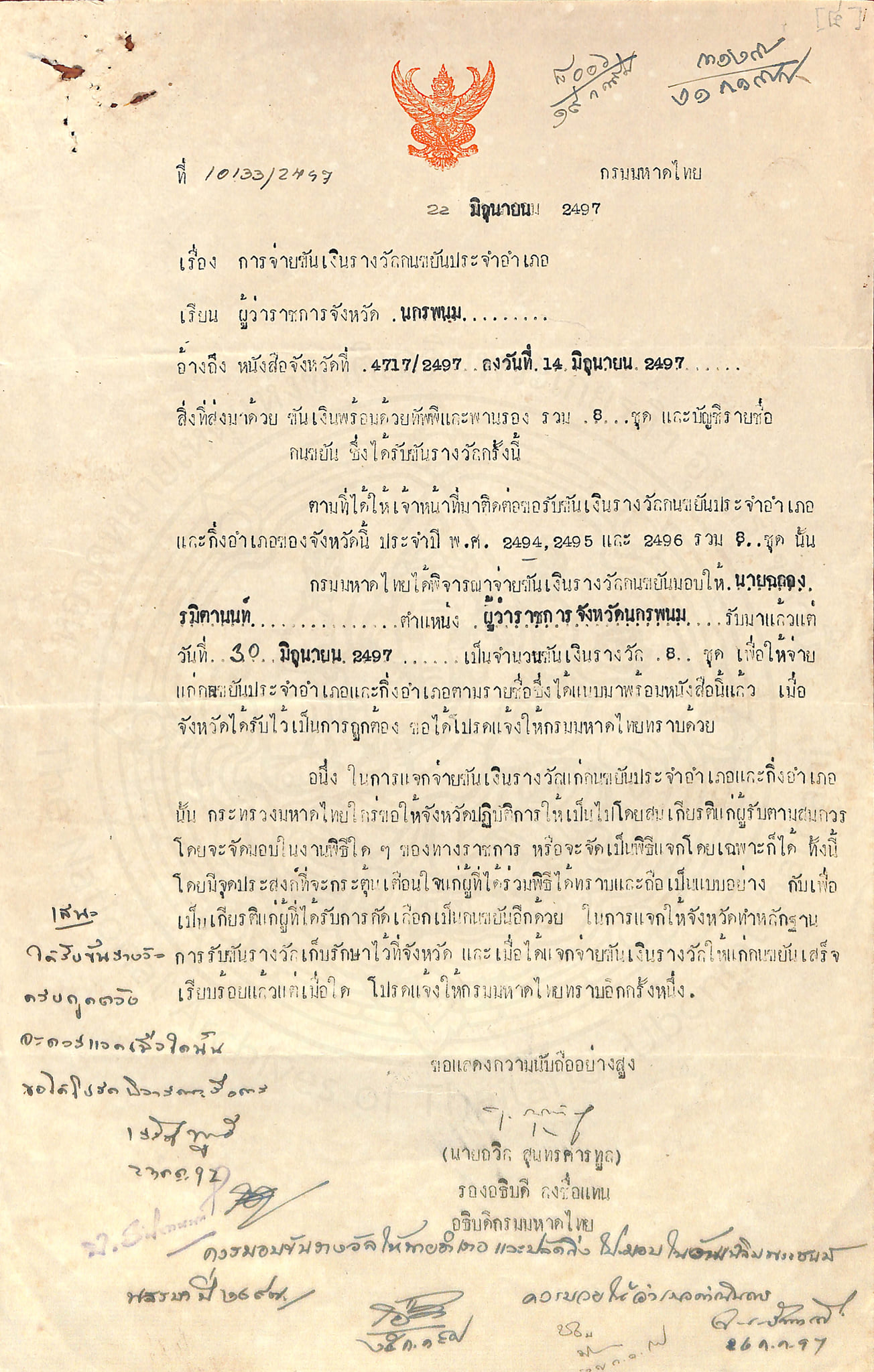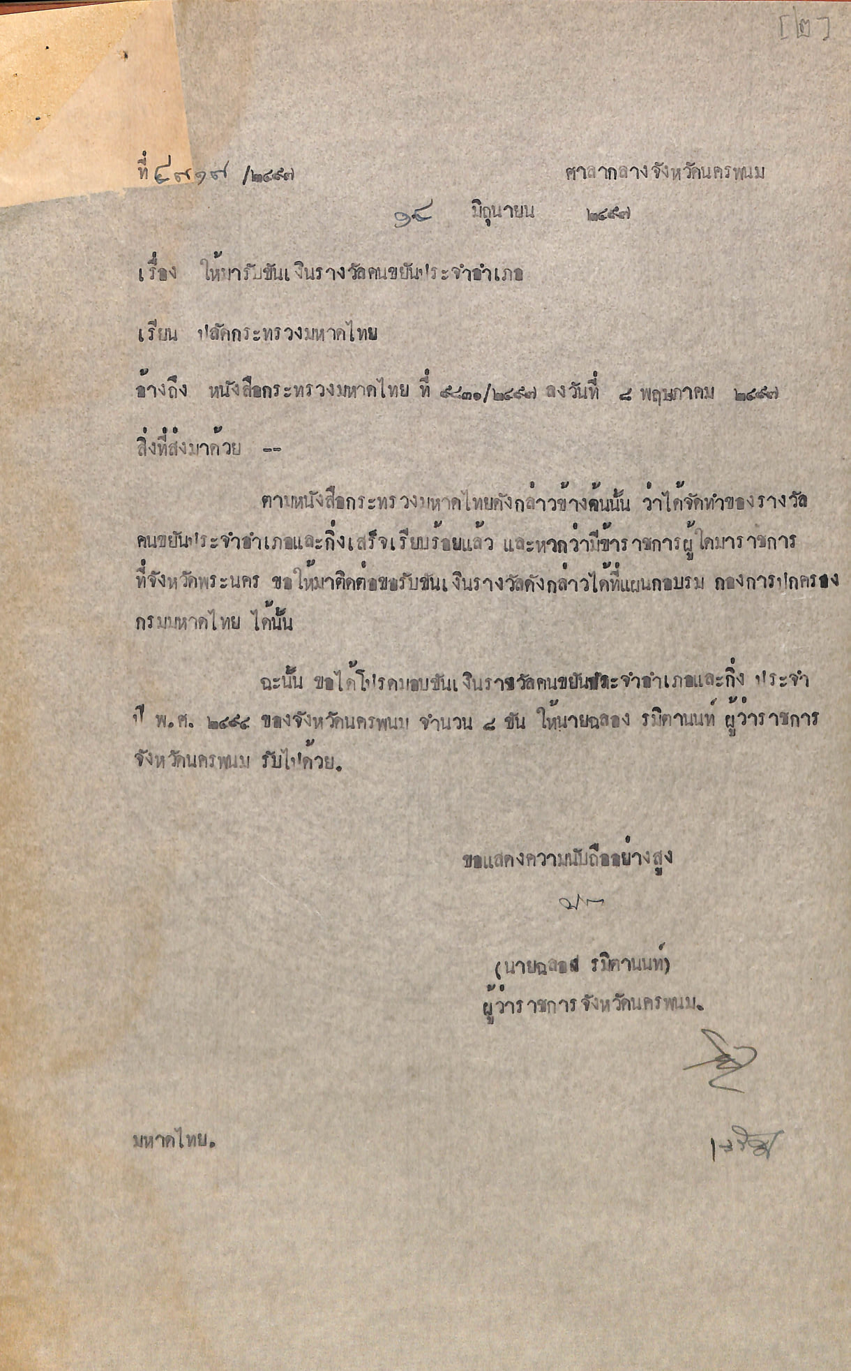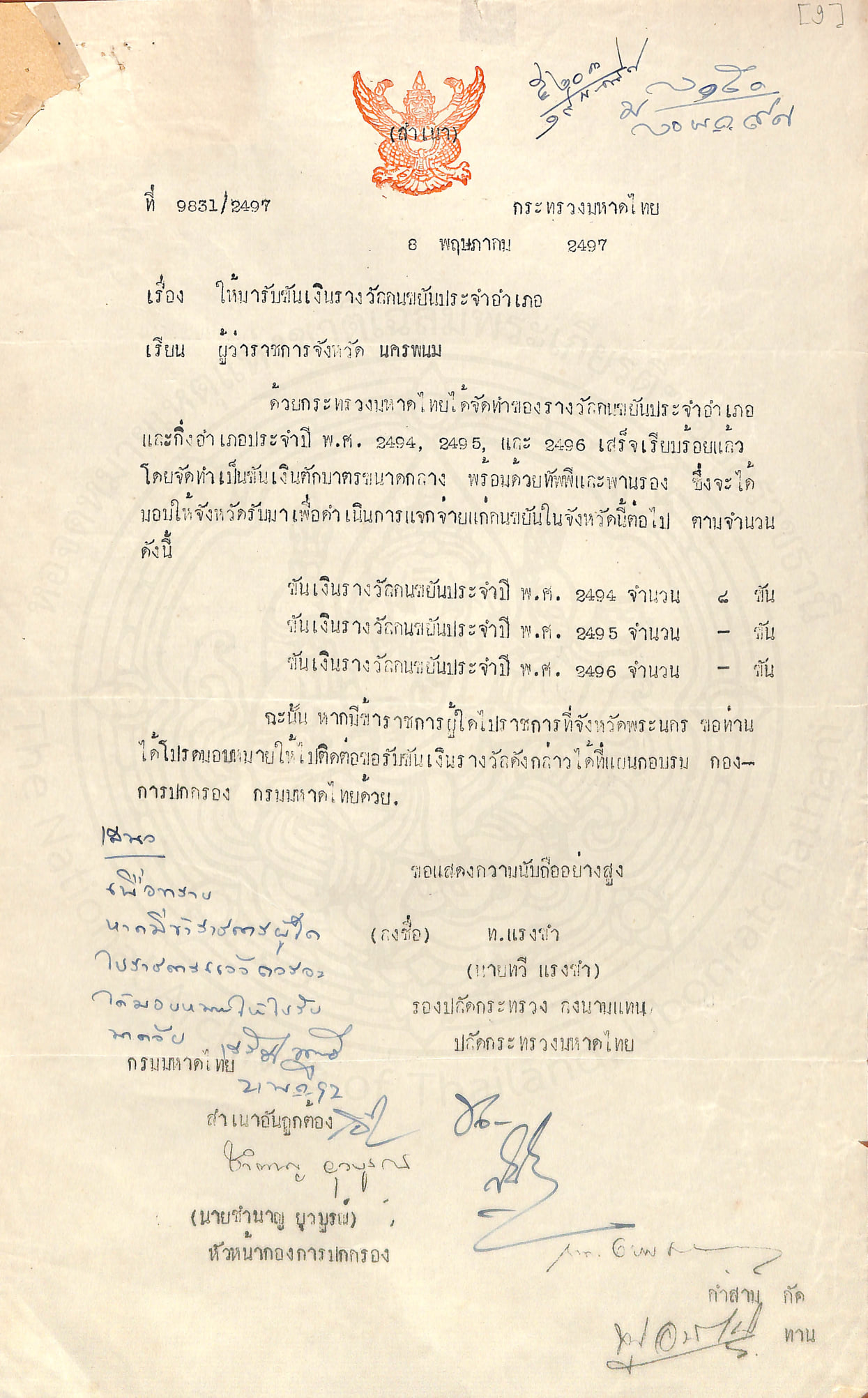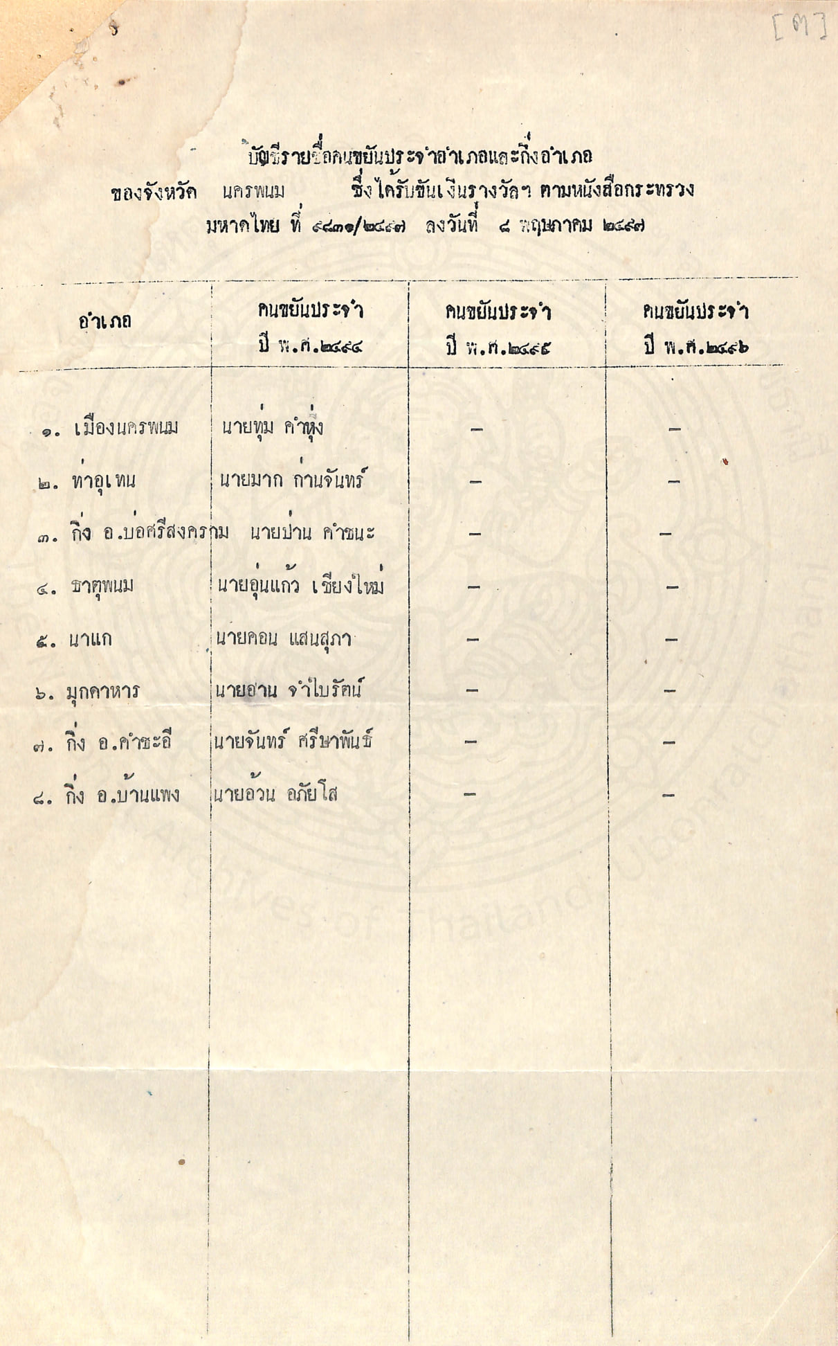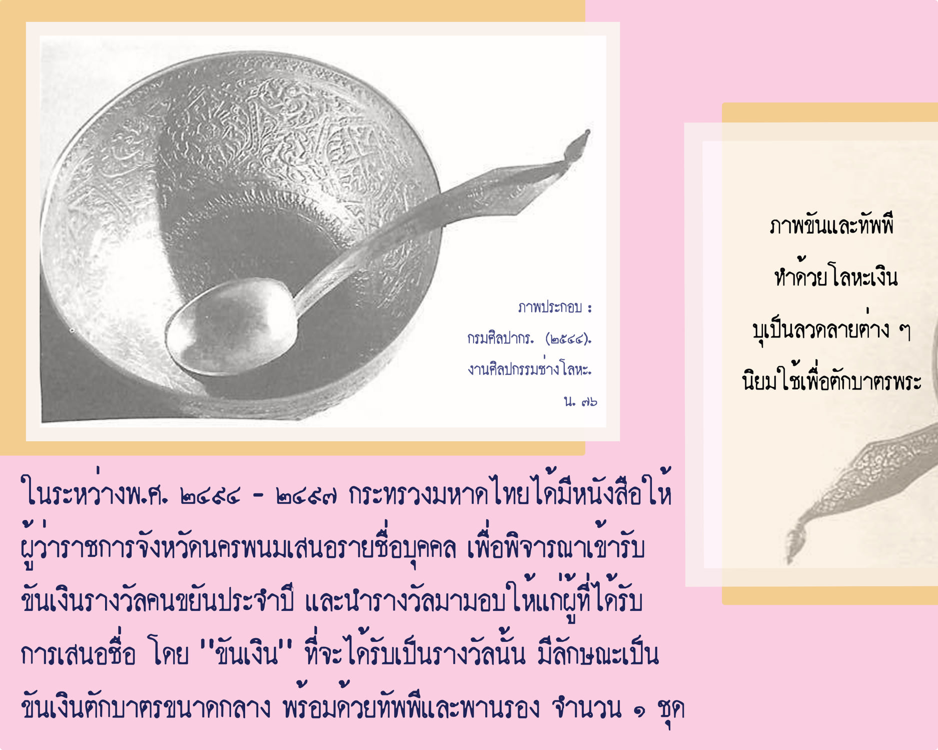 ในระหว่างพ.ศ. ๒๔๙๔ - ๒๔๙๗ กระทรวงมหาดไทยได้มีหนังสือให้ผู้ว่าราชการจังหวัดนครพนมเสนอรายชื่อบุคคล เพื่อพิจารณาเข้ารับขันเงินรางวัลคนขยันประจำปี และนำรางวัลมามอบให้แก่ผู้ที่ได้รับการเสนอชื่อ โดย “ขันเงิน” ที่จะได้รับเป็นรางวัลนั้น มีลักษณะเป็นขันเงินตักบาตรขนาดกลาง พร้อมด้วยทัพพีและพานรอง จำนวน ๑ ชุด โดยการมอบจะต้องปฏิบัติตามวัตถุประสงค์ของกระทรวงมหาดไทยตามที่ระบุในหนังสือว่า