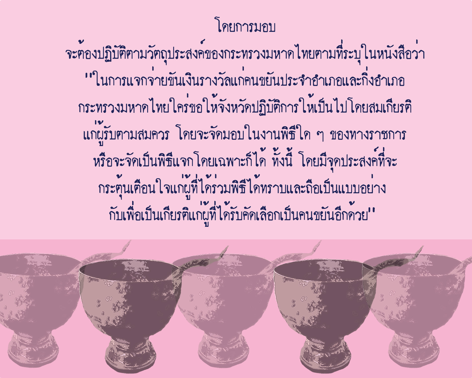 “ในการแจกจ่ายขันเงินรางวัลแก่คนขยันประจำอำเภอและกิ่งอำเภอ กระทรวงมหาดไทยใคร่ขอให้จังหวัดปฏิบัติการให้เป็นไปโดยสมเกียรติแก่ผู้รับตามสมควร โดยจะจัดมอบในงานพิธีใด ๆ ของทางราชการหรือจะจัดเป็นพิธีแจกโดยเฉพาะก็ได้ ทั้งนี้ โดยมีจุดประสงค์ที่จะกระตุ้นเตือนใจแก่ผู้ที่ได้ร่วมพิธีได้ทราบและถือเป็นแบบอย่าง กับเพื่อเป็นเกียรติแก่ผู้ที่ได้รับคัดเลือกเป็นคนขยันอีกด้วย”