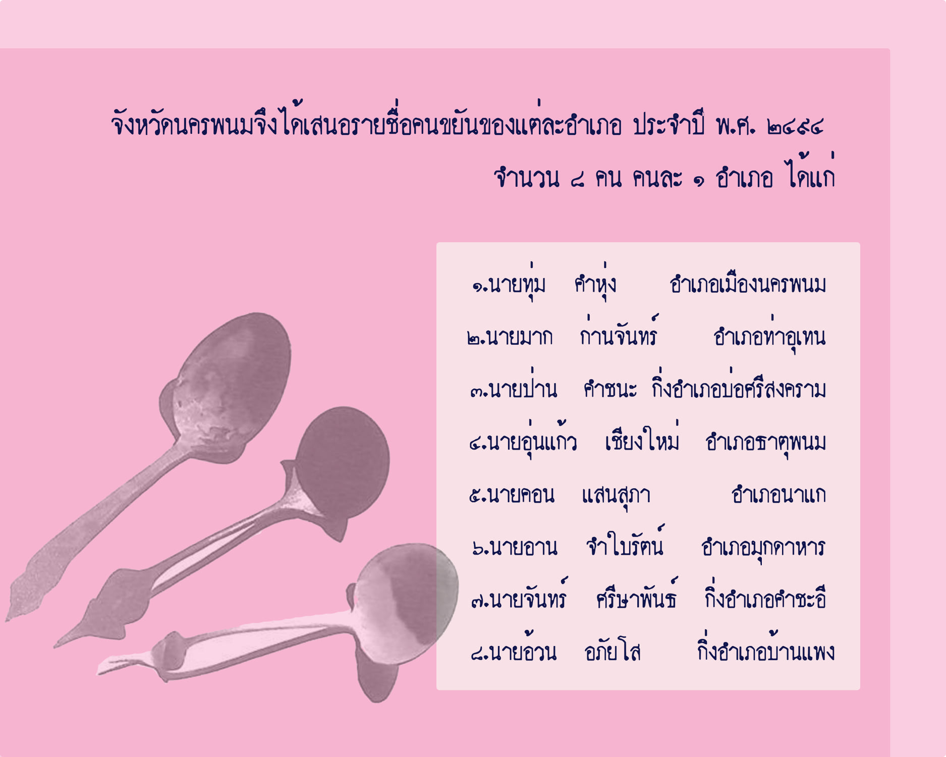 จังหวัดนครพนมจึงได้เสนอรายชื่อคนขยันของแต่ละอำเภอ ประจำปี พ.ศ. ๒๔๙๔ จำนวน ๘ คน คนละ ๑ อำเภอ ได้แก่ ๑.นายทุ่ม คำหุ่ง อำเภอเมืองนครพนม ๒.นายมาก ก่านจันทร์ อำเภอท่าอุเทน ๓.นายป่าน คำชนะ กิ่งอำเภอบ่อศรีสงคราม ๔.นายอุ่นแก้ว เชียงใหม่ อำเภอธาตุพนม ๕.นายคอน แสนสุภา อำเภอนาแก ๖.นายอาน จำใบรัตน์ อำเภอมุกดาหาร ๗.นายจันทร์ ศรีษาพันธ์ กิ่งอำเภอคำชะอี ๘.นายอ้วน อภัยโส กิ่งอำเภอบ้านแพง