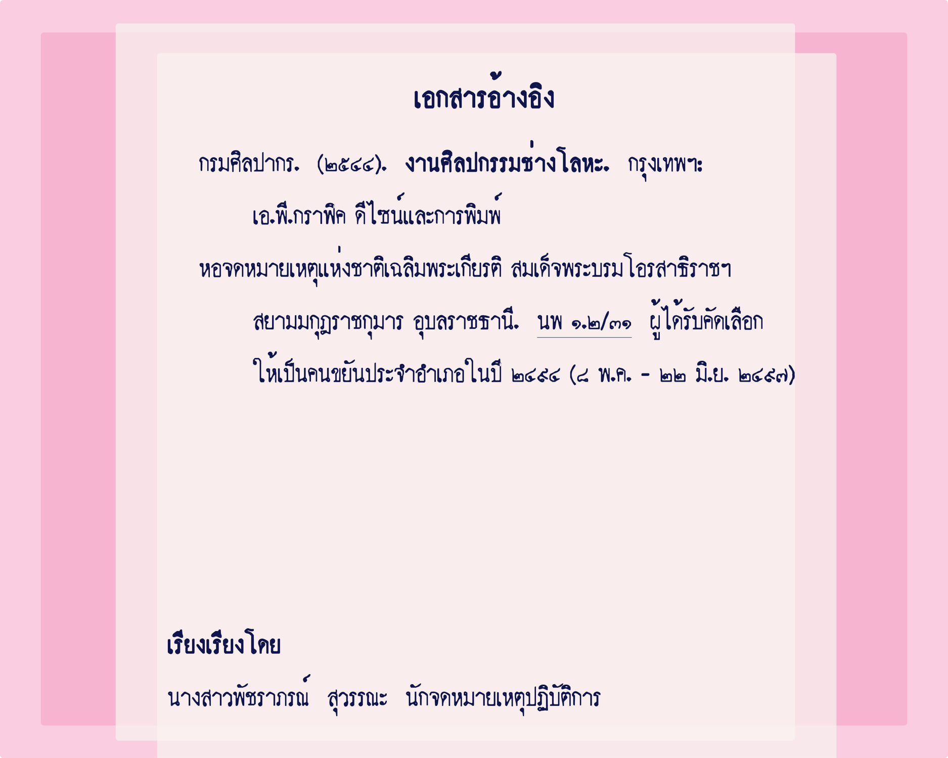 - กรมศิลปากร. (๒๕๔๔). งานศิลปกรรมช่างโลหะ. กรุงเทพฯ: เอ.พี.กราฟิค ดีไซน์และการพิมพ์ - หอจดหมายเหตุแห่งชาติเฉลิมพระเกียรติ สมเด็จพระบรมโอรสาธิราชฯ สยามมกุฎราชกุมาร อุบลราชธานี. นพ ๑.๒/๓๑ ผู้ได้รับคัดเลือกให้เป็นคนขยันประจำอำเภอในปี ๒๔๙๔ (๘ พ.ค. - ๒๒ มิ.ย. ๒๔๙๗)