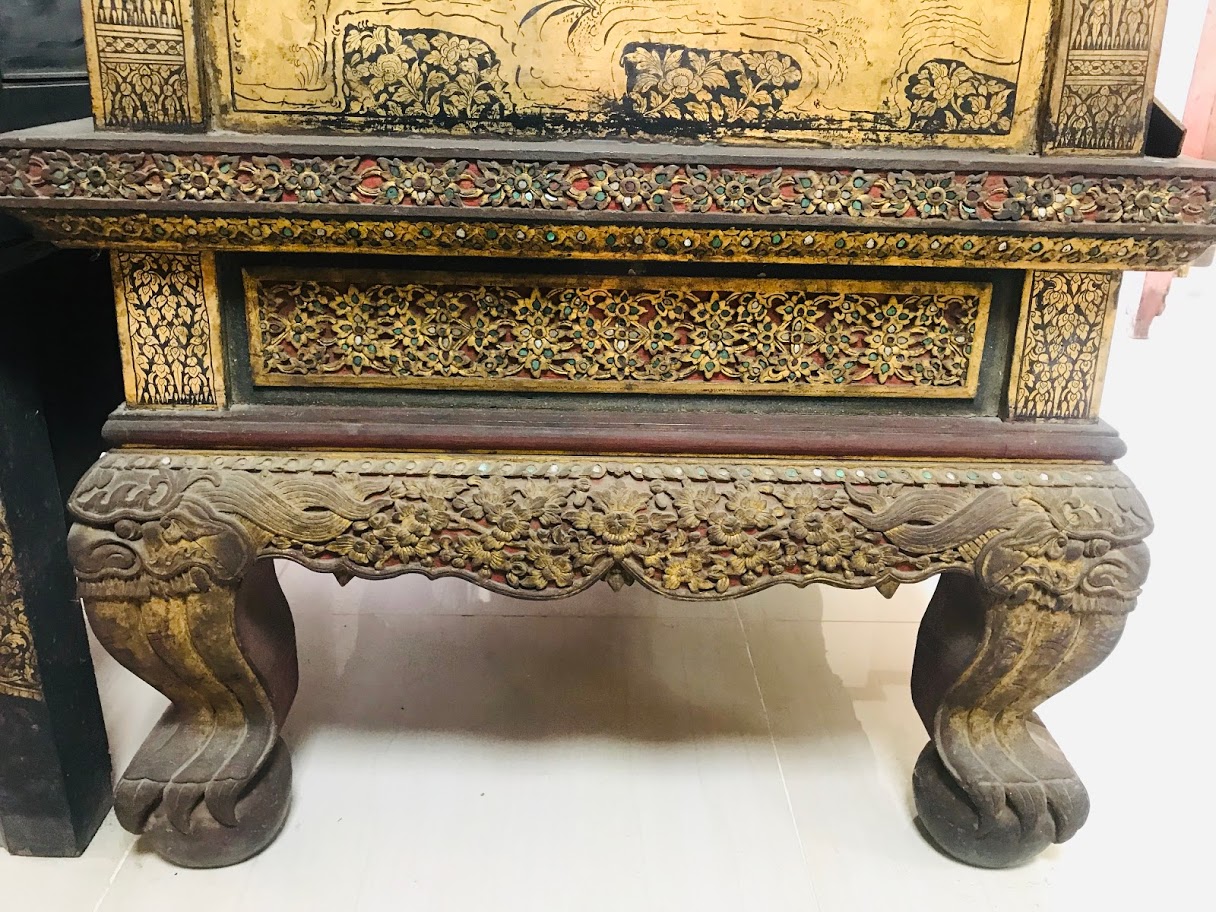 ๖. ตู้ฐานสิงห์ ทำฐานตู้เป็นรูปฐานสิงห์ จำหลักลายและประดับตกแต่งด้วยลวดลายที่งดงาม