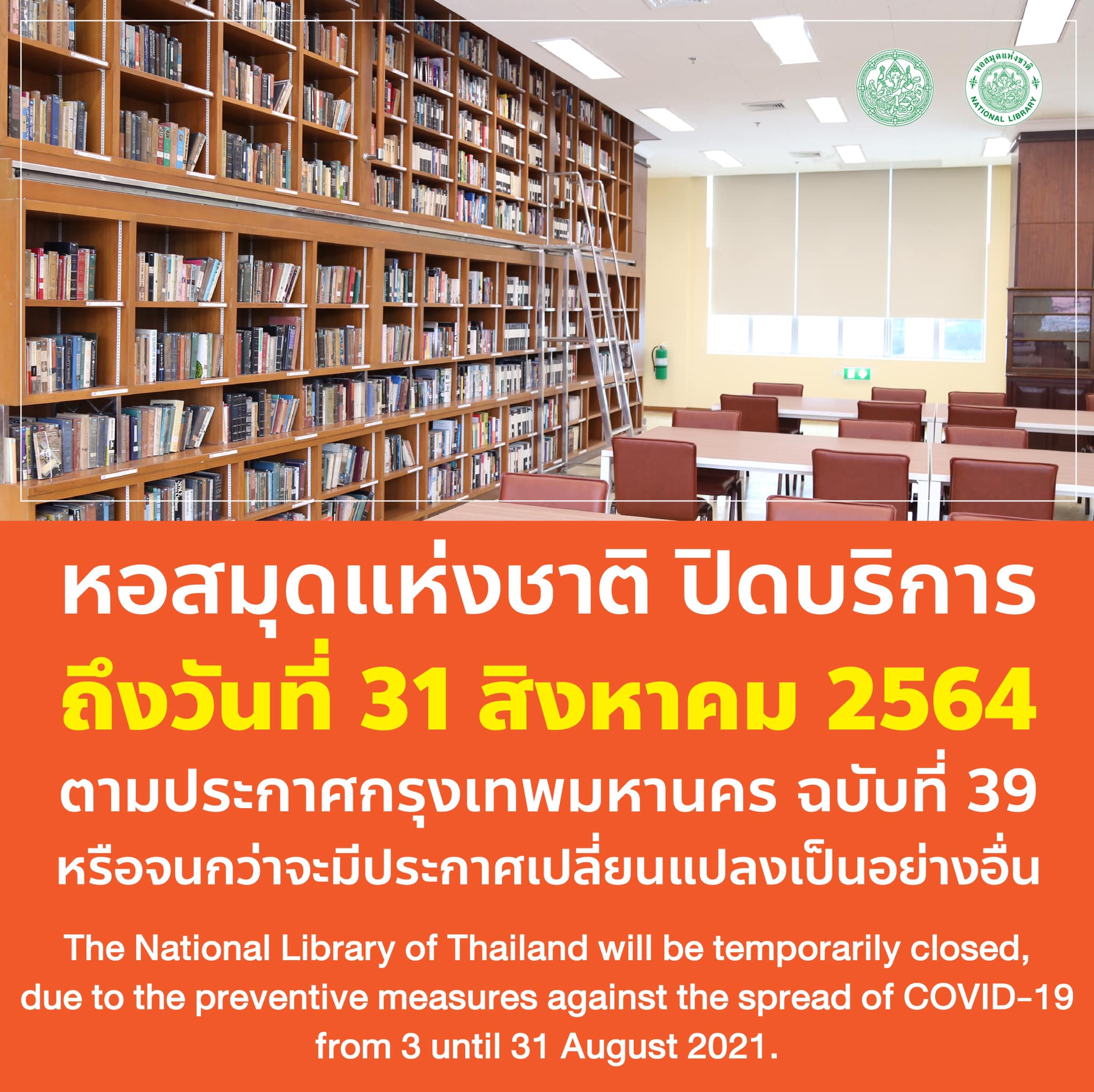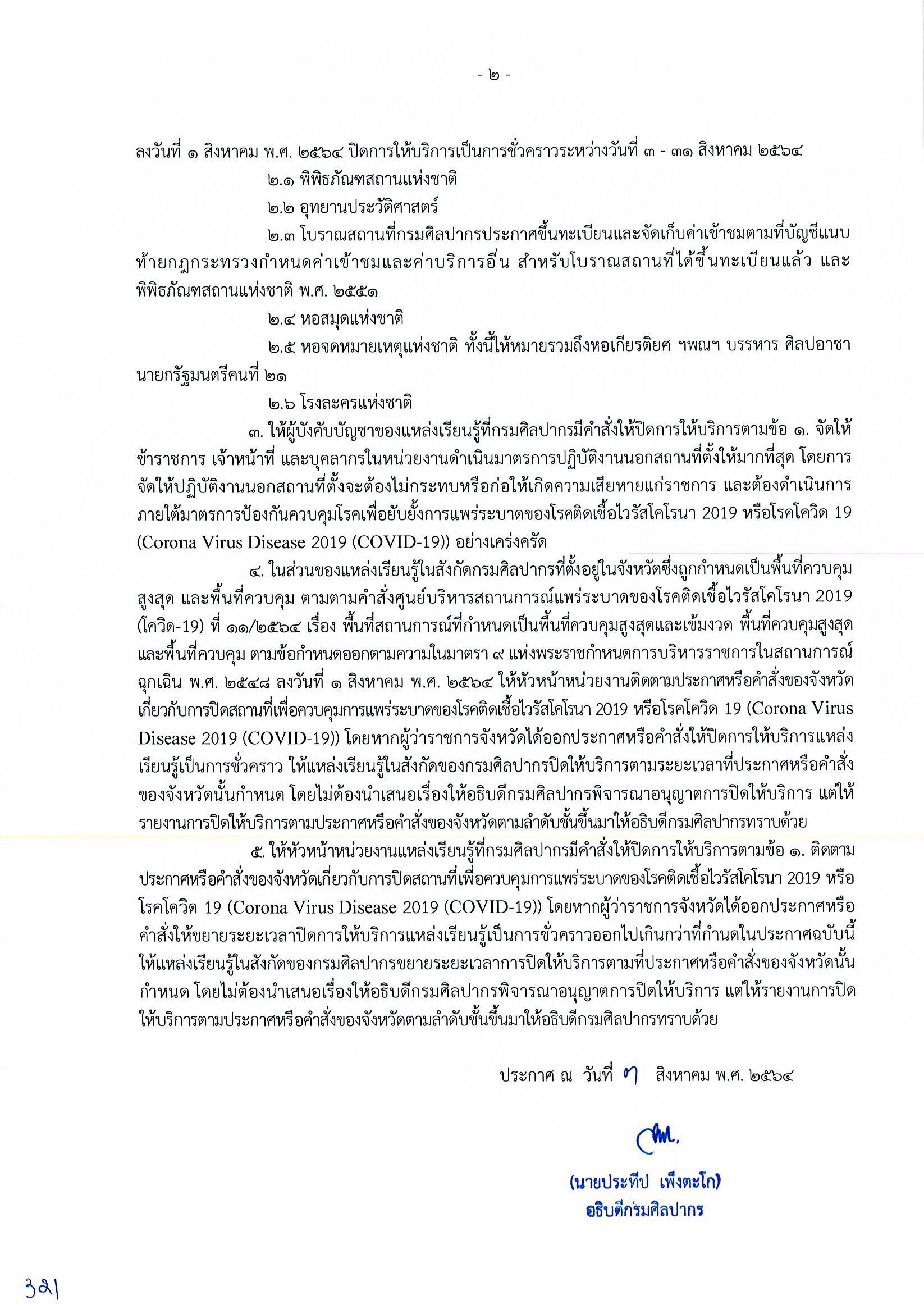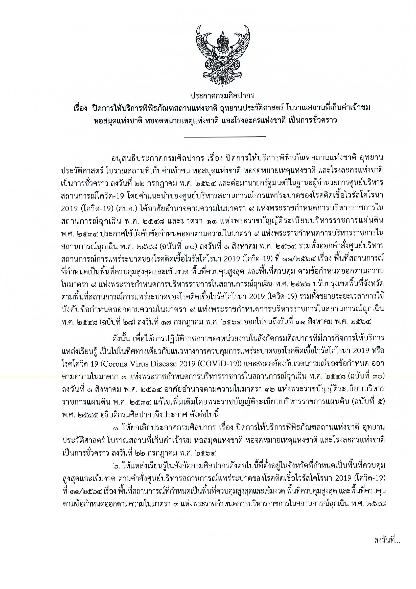 กรมศิลปากร ออกประกาศปิดการให้บริการพิพิธภัณฑสถานแห่งชาติ อุทยานประวัติศาสตร์ โบราณสถานที่เก็บค่าเข้าชม หอสมุดแห่งชาติ หอจดหมายเหตุแห่งชาติ และโรงละครแห่งชาติ ที่ตั้งอยู่ในจังหวัด ที่กำหนดเป็นพื้นที่ควบคุมสูงสุดและเข้มงวด เป็นการชั่วคราว ระหว่างวันที่ ๓ – ๓๑ สิงหาคม ๒๕๖๔