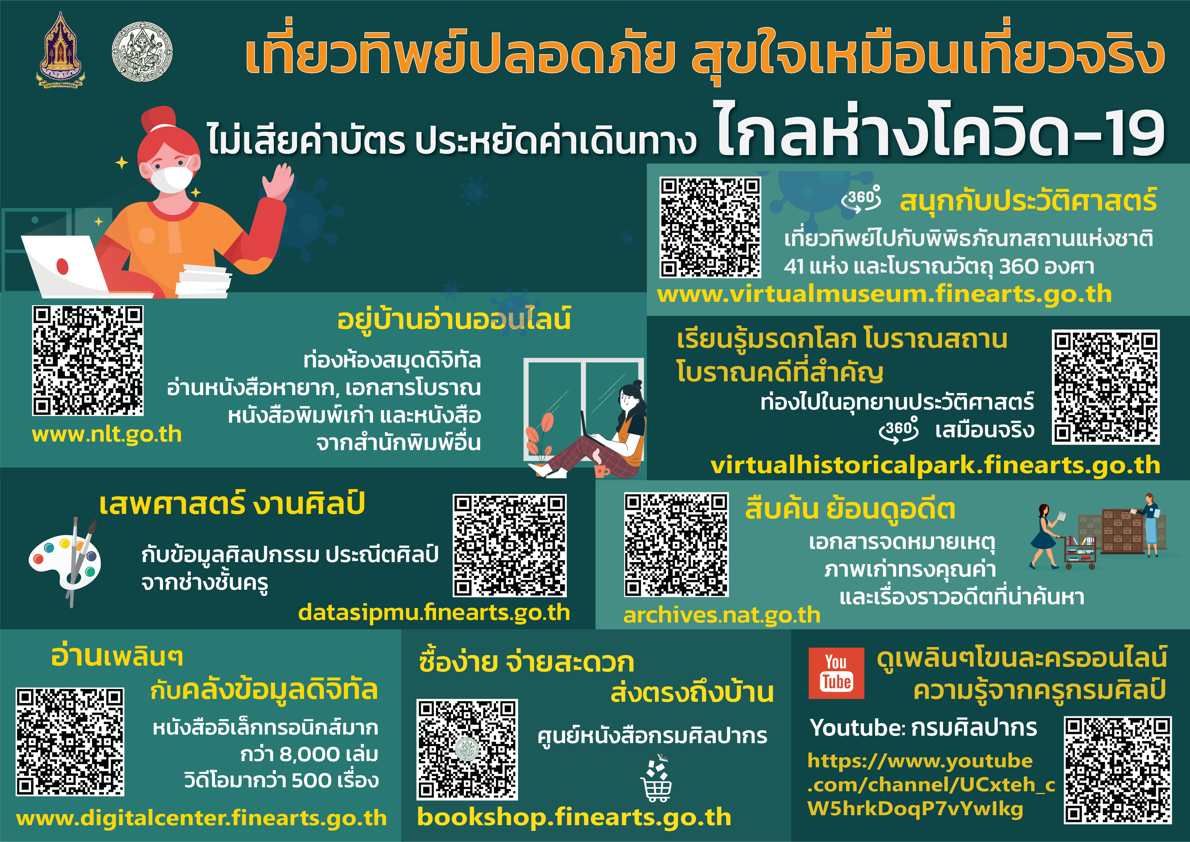 นอกจากนี้ กรมศิลปากรยังปรับรูปแบบการเสวนาให้ความรู้ผ่านระบบออนไลน์ เผยแพร่องค์ความรู้ ด้านศิลปวัฒนธรรม ผ่านทางสื่อสังคมออนไลน์ (facebook) ของหน่วยงานในสังกัด และวีดิทัศน์สาระความรู้ต่าง ๆ ผ่านช่องทาง YouTube กรมศิลปากร โดยสามารถติดตามรายละเอียดงานบริการและองค์ความรู้ต่าง ๆ ได้ที่เว็บไซต์กรมศิลปากร finearts.go.th