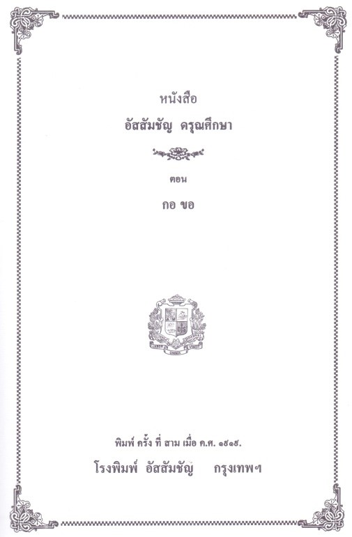 ภายหลังได้เล็งเห็นว่าอัสสัมชัญ ดรุณศึกษา ตอน กอ ขอ มีรูปเล่มที่หนาเกินไปสำหรับเด็กเล็ก ดังนั้นในการพิมพ์ครั้งที่ ๔ จึงแบ่งพิมพ์ออกเป็น อัสสัมชัญ ดรุณศึกษา ตอน กอ ขอ และอัสสัมชัญ ดรุณศึกษา ตอนต้น ส่วนที่เหลือคงเดิม จึงกล่าวได้ว่าตั้งแต่ พ.ศ. ๒๔๖๔ นักเรียนโรงเรียนอัสสัมชัญมีแบบเรียน “อัสสัมชัญ ดรุณศึกษา” ใช้เรียนทั้งหมด ๔ เล่ม จวบจนกระทั่งสิขสิทธิ์ของ “อัสสัมชัญ ดรุณศึกษา” ได้ตกเป็นของสำนักพิมพ์ไทยวัฒนาพานิช ในระยะเวลาต่อมาจึงได้ทำการเปลี่ยนชื่อเป็น “ดรุณศึกษา”