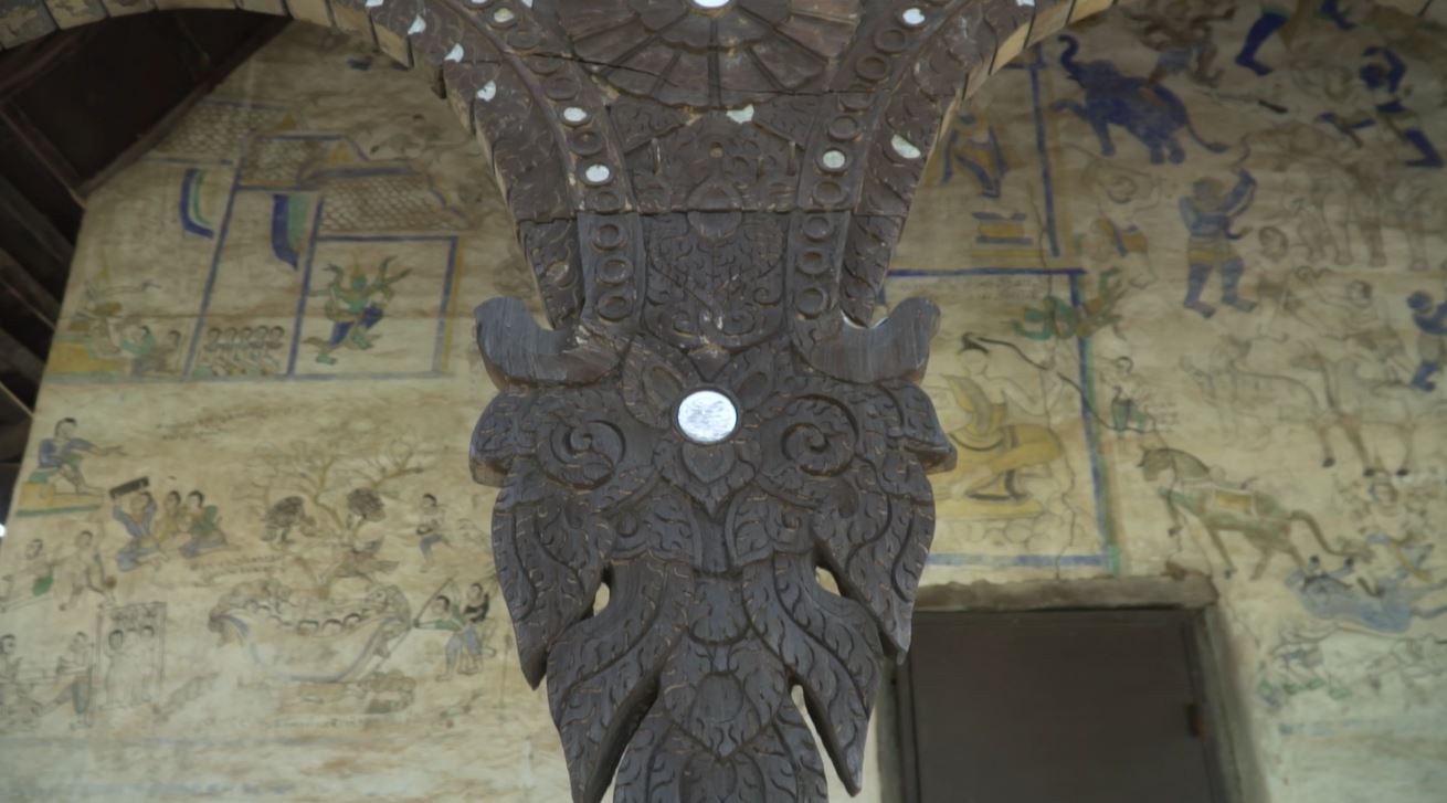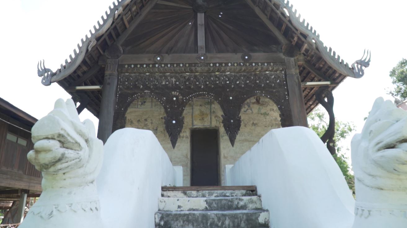 สิม (อุโบสถ) หลังเก่า ลักษณะเป็นสิมทึบ ก่ออิฐถือปูน ตั้งบนฐานเอวขัน หันหน้าไปทางทิศตะวันออก ขนาด ๓ ห้อง รวมห้องมุขด้านหน้า มีประตูทางเข้าด้านทิศตะวันออกเชื่อมต่อกับบันได โครงสร้างอาคาร ใช้เสาและผนังรับโครงสร้างหลังคาทรงจั่ว มุงกระเบื้องไม้ (แป้นเกล็ด) หน้าบันตีไม้เป็นลายตะวัน ประดับกระจกเงา มุมทั้งสามของหน้าบันประดับดอกลอยขนาดใหญ่ แผงรวงผึ้งไม่มีเสาด้านในคู่หน้า ทำให้รวงผึ้งหย่อนเกือบถึงระดับเดียวกับระเบียงห้องมุข ประดับไม้แกะสลักลายกนกเครือ และลายดอกลอยด้านล่างบริเวณโค้งรวงผึ้ง คันทวยเป็นไม้แกะสลัก ผนังภายนอกด้านหน้ามีฮูปแต้ม (ภาพจิตรกรรม) เป็นภาพ พุทธประวัติตอนพระพุทธเจ้าออกผนวช ภาพมารผจญ และภาพขุมนรก ด้านในอุโบสถเป็นภาพวรรณคดี เรื่องสังข์สินไซ (สังข์ศิลป์ชัย)