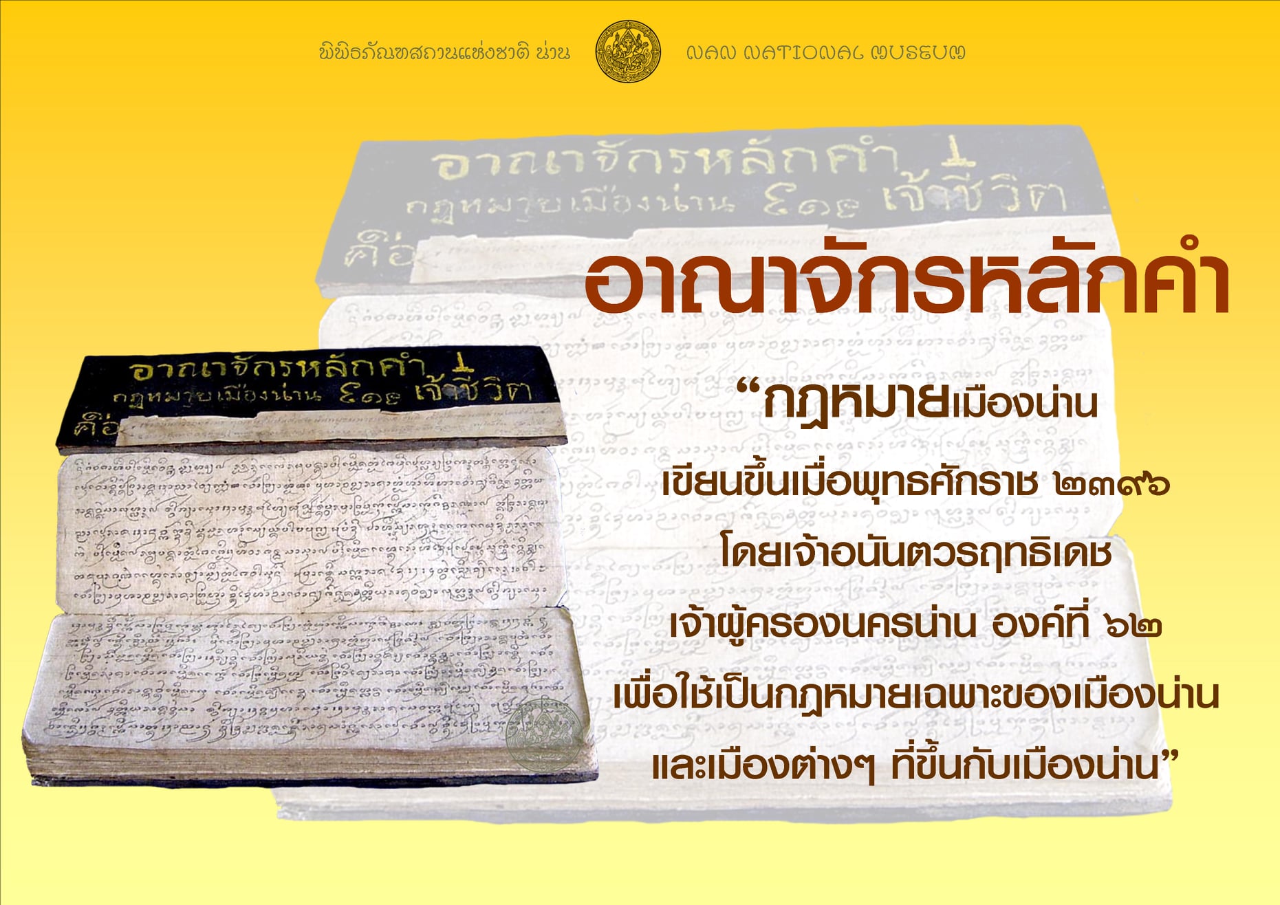 ๒. อาณาจักรหลักคำ หรือ กฎหมายเมืองน่าน เขียนขึ้นเมื่อพุทธศักราช ๒๓๙๖ โดยเจ้าอนันตวรฤทธิเดช เจ้าผู้ครองนครน่าน องค์ที่ ๖๒ เพื่อใช้เป็นกฎหมายเฉพาะของเมืองน่าน และเมืองต่างๆ ที่ขึ้นกับเมืองน่าน
