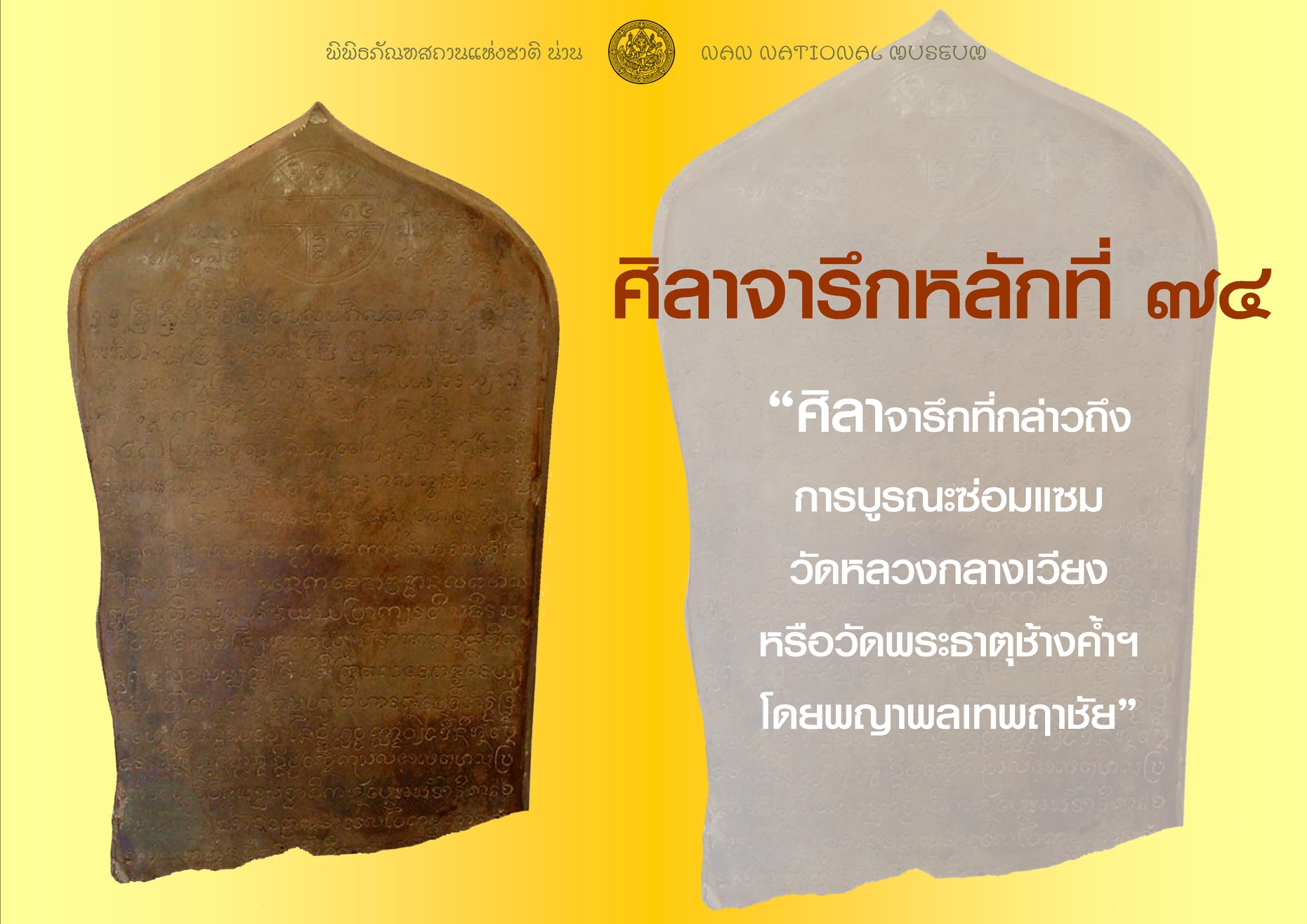 ๖. ศิลาจารึกหลักที่ ๗๔ กล่าวถึงการบูรณะซ่อมแซมวัดหลวงกลางเวียงหรือวัดพระธาตุช้างค้ำฯ โดยพญาพลเทพฤาชัย