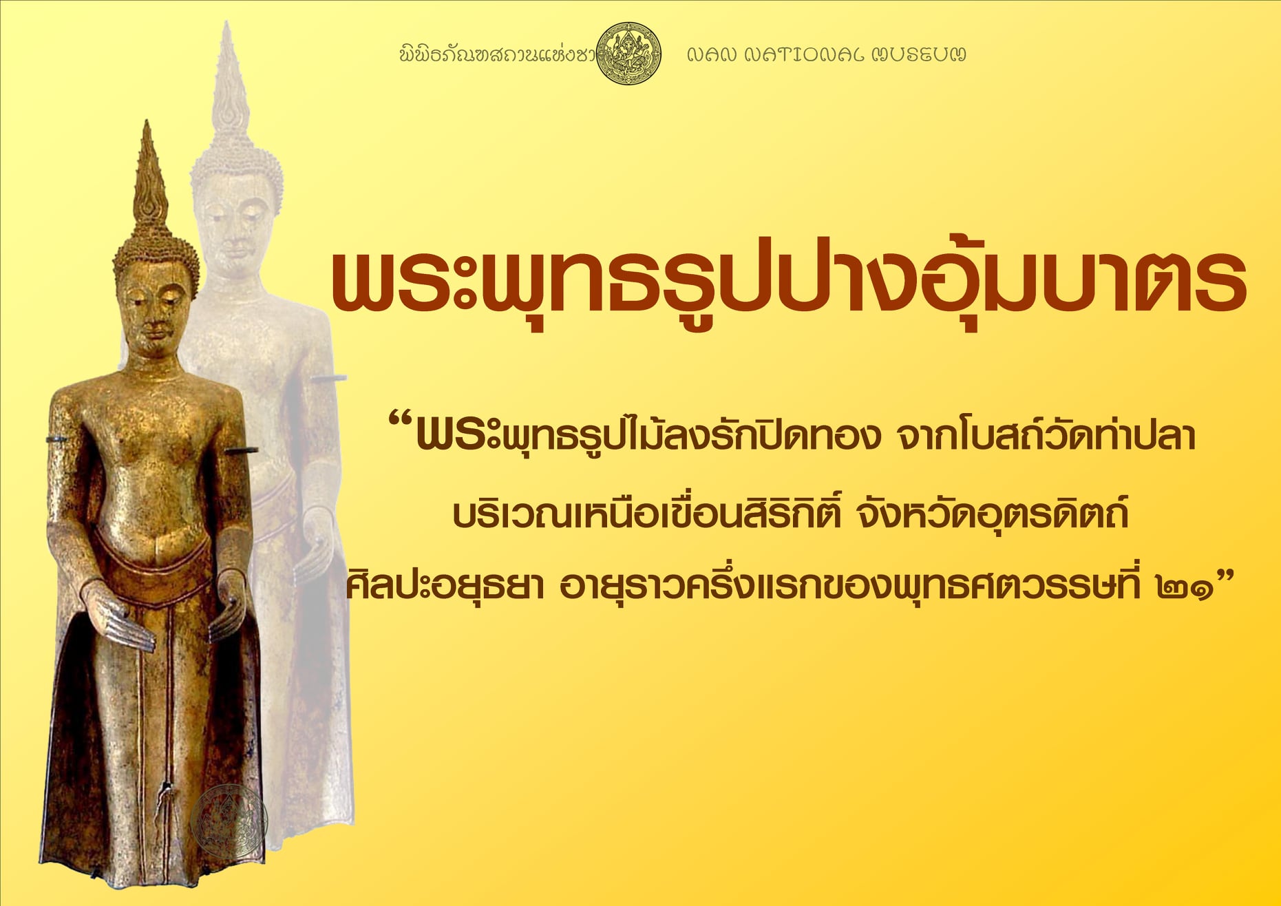 ๗. พระพุทธรูปปางอุ้มบาตร ศิลปะอยุธยา อายุราวครึ่งแรกของพุทธศตวรรษที่ ๒๑ ทำจากไม้ ลงรักปิดทอง ได้จากโบสถ์วัดท่าปลา บริเวณเหนือเขื่อนสิริกิติ์ จังหวัดอุตรดิตถ์